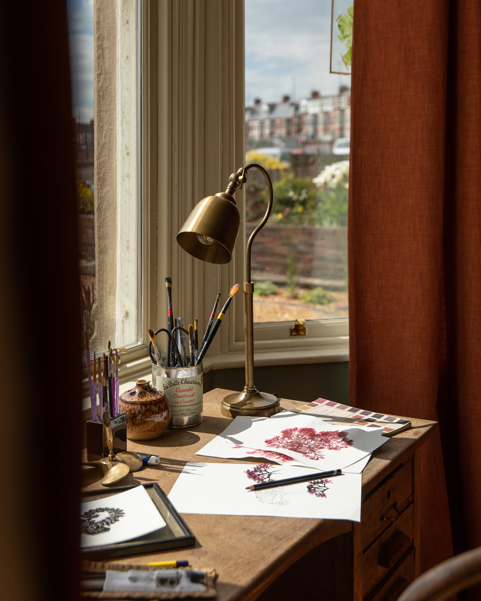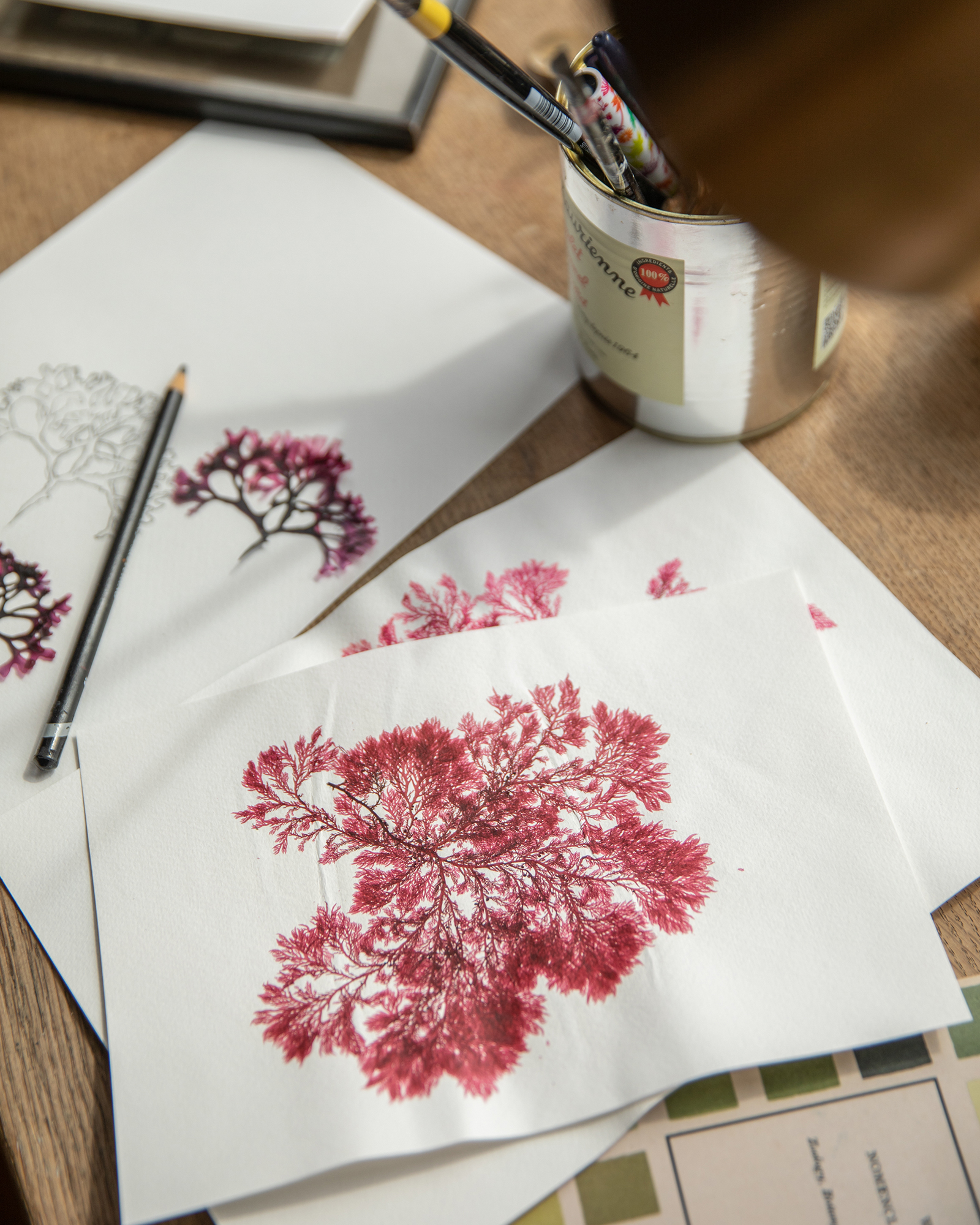 The sea itself, meanwhile, is a constant and ever-shifting source of inspiration. Caroline often presses seaweed she collects on coastal walks, using the specimens for cyanotype prints made in sunshine. “Searching for the perfect specimen keeps me absorbed, and I often come home with pockets soggy from the delicate finds.”