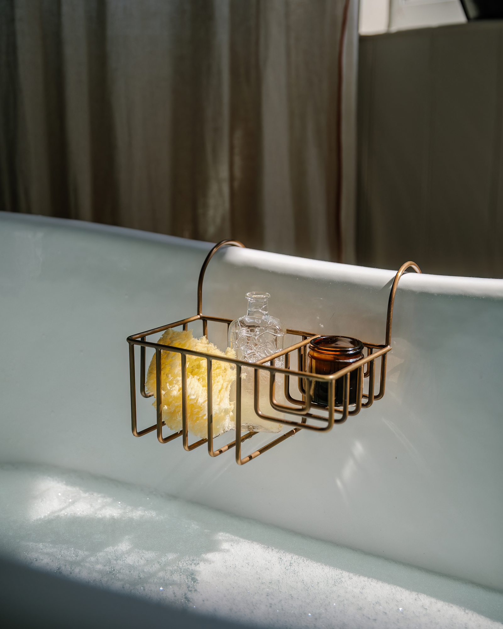 Caroline is drawn to natural materials that bring warmth and character: marble, wool, reclaimed wood (“wood is a real golden thread running through the house – especially reclaimed wood – and I love how it links the rooms together with quiet warmth and character.”). It is no surprise, then, that Rowen & Wren’s pieces have found a happy place here. Her brass bath caddy is a favourite.