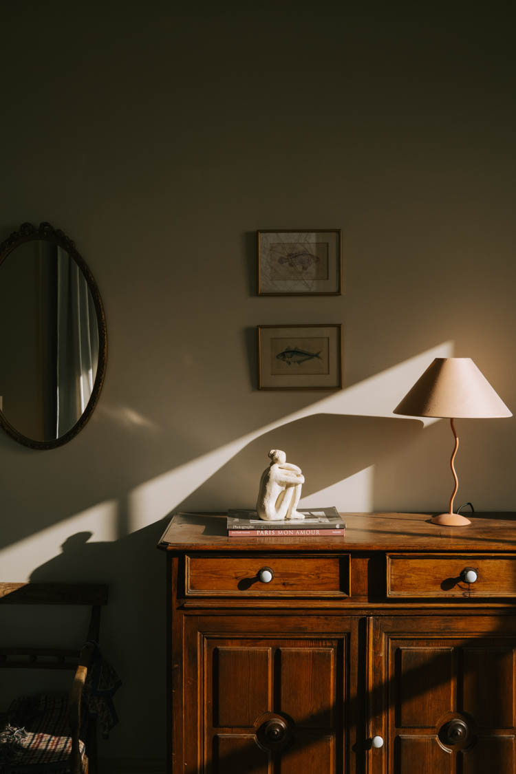 “Two of my most loved are from my parents: a chest of drawers that belonged to my father and my mother’s kitchen table, originally from Prague,” she says. “The chest has travelled from France to Sweden to here, and its worn edges carry years of history. The table is where I grew up – every scratch tells a tale of family meals and quiet mornings. Then there’s a little ceramic vase I found at a flea market in Nice. It has no real value, but something about it reminds me of my grandmother’s house. It’s these modest, meaningful pieces that make a home truly yours.”