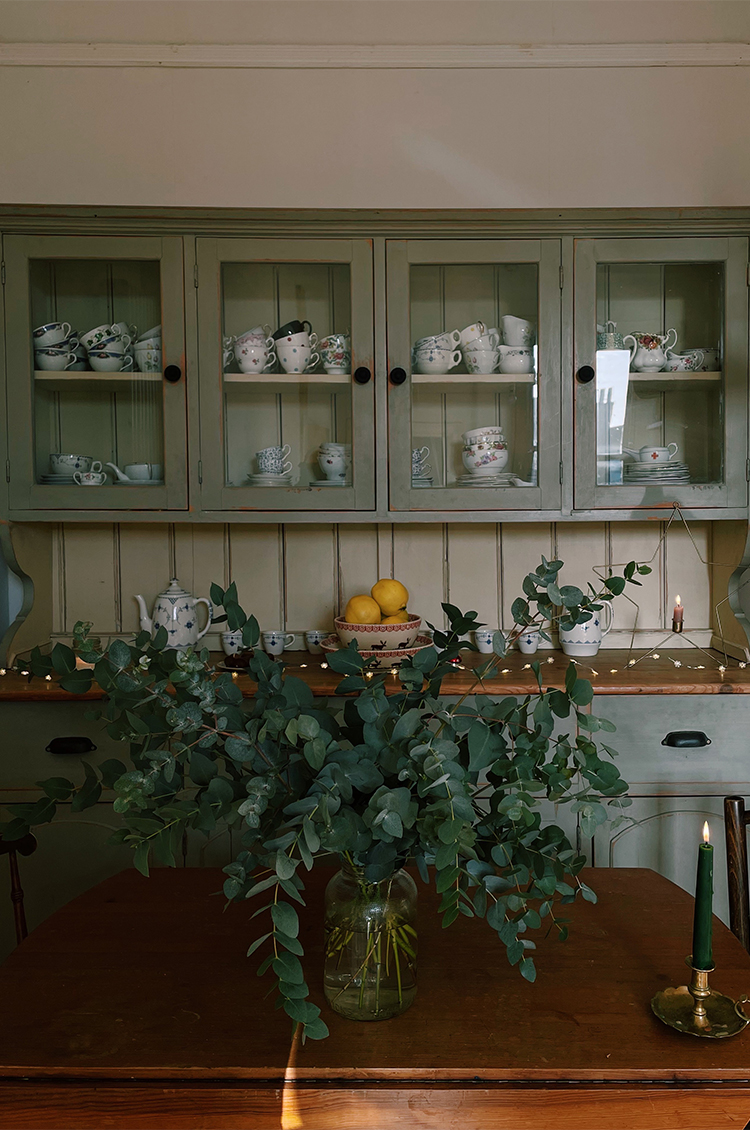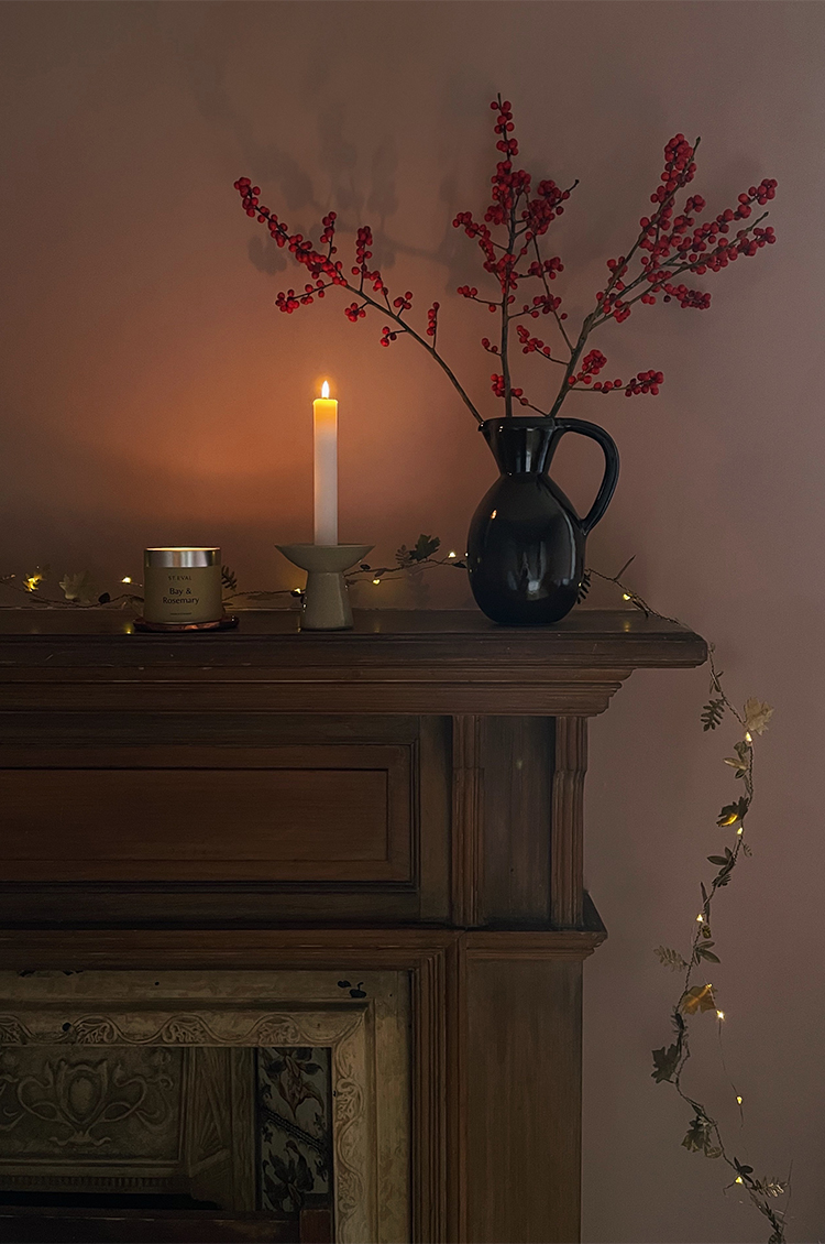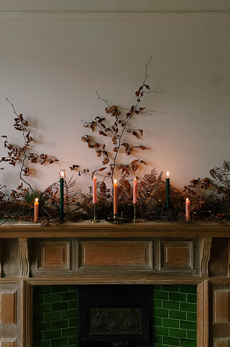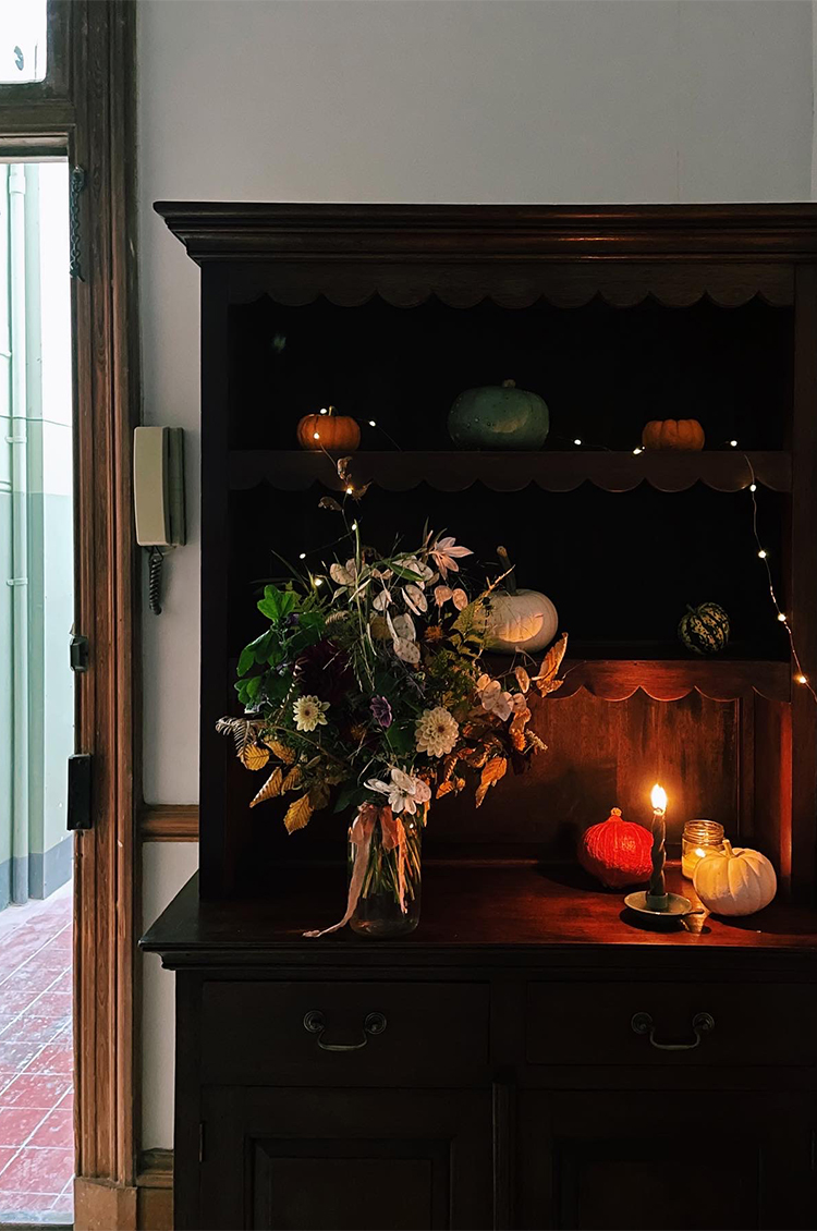 ‘In autumn and winter, it means time spent nesting and preparing our home for colder days, creating cosy corners and leaning into the darkness,’ she explains. ‘I take my cues from nature: whereas in the spring and summer I love bringing in fresh, local and seasonal flowers, now I turn to foraged evergreens, pinecones, as well as pressed and preserved flowers and foliage to bring the outside in – a reminder of life and beauty in the darker half of the year. I also use natural materials to feel more connected with the outdoors and the seasons, such as beeswax candles and woollen blankets to add cosy light and texture.’
