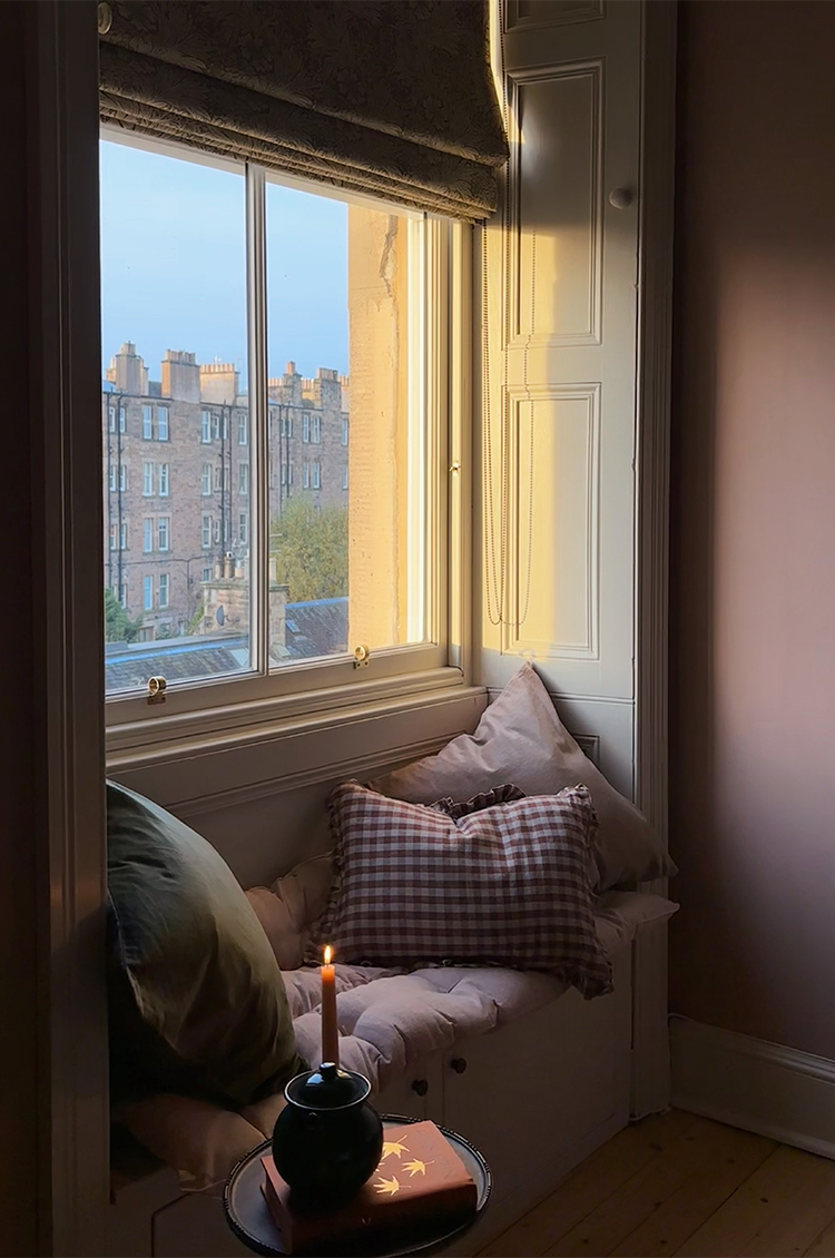 A new addition for this year is a sensational window seat overlooking a communal garden, a cocoon she has crafted in layers of Rowen & Wren textiles. It is the ideal vantage point for watching the changing seasons from the great indoors when the cold bites.