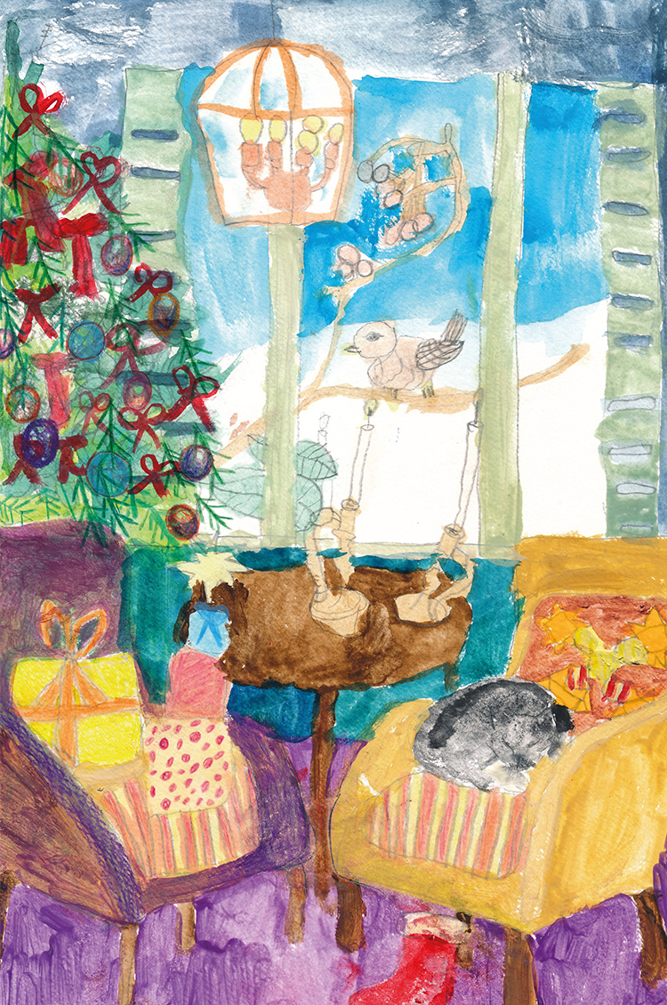 The chosen piece was created by Annie Brennand-Roper, whose watercolour captures the spirit of Rowen & Wren with charm and detail. Inspired by our imagery and seasonal palette, Annie imagined a traditional Christmas living room: armchairs draped in fabric, a chandelier glowing above, candles flickering softly - and her playful touch, a bird perched at the centre and a cat curled up contentedly in one of the armchairs.