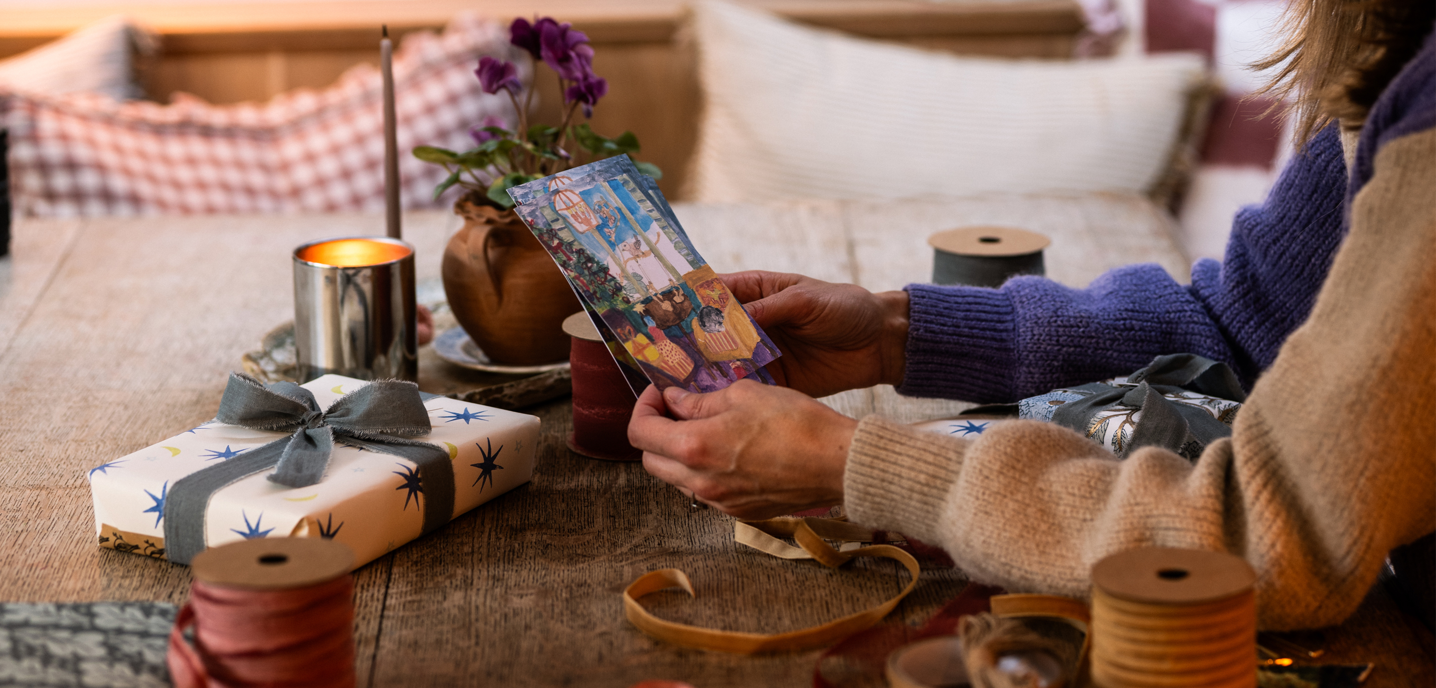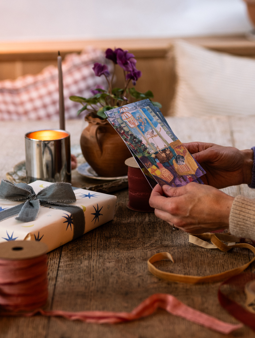 One of the first initiatives to grow from our partnership has been this season’s postcard collaboration, a much-loved Rowen & Wren tradition. Each season, we commission a British artist to design a postcard inspired by our latest collection. This Christmas, we invited the ArtVenture artists to take part.