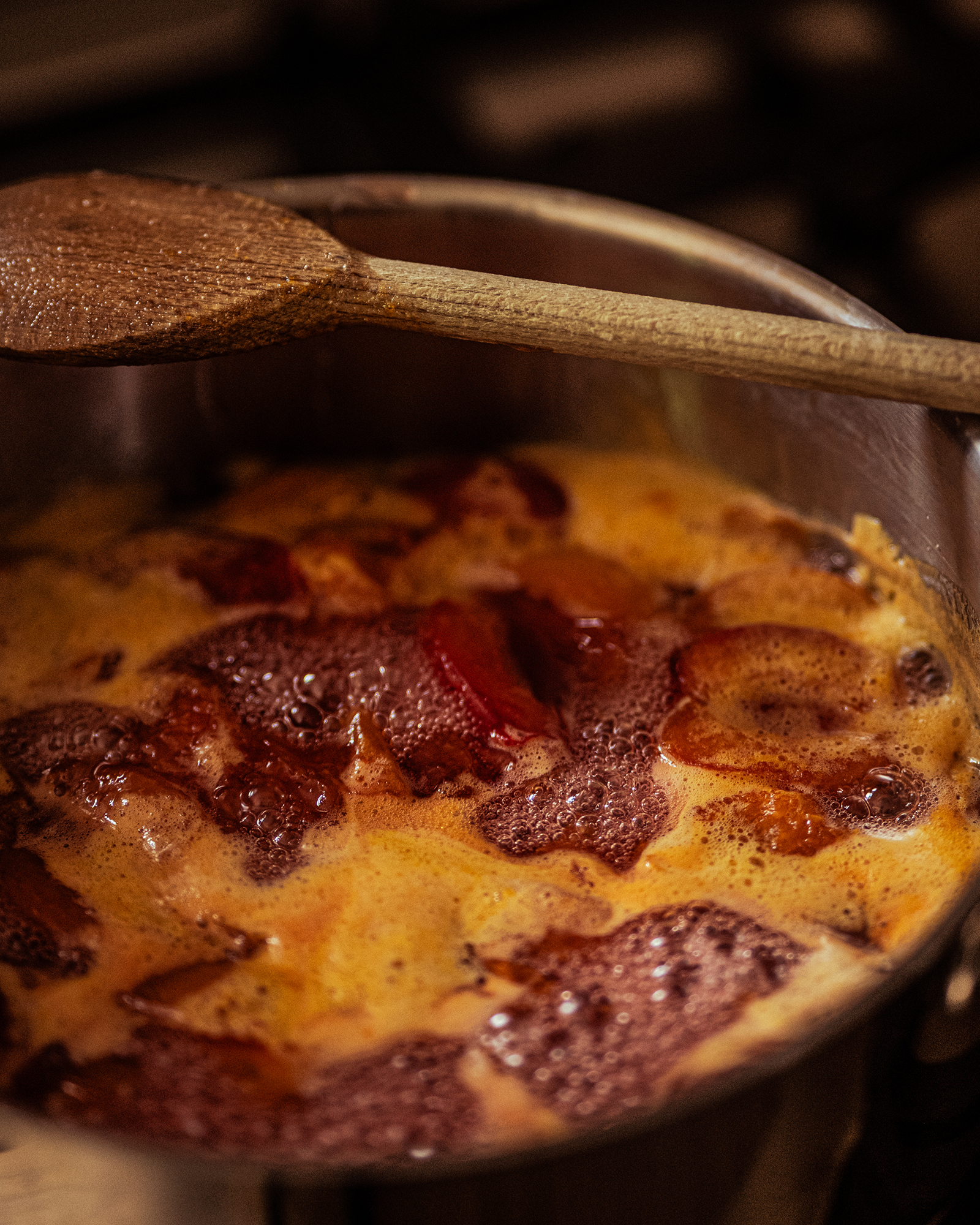 3. Return this to the pan with the sugar and a pinch of salt and cook over a medium-low heat for another 40–50 minutes until it has thickened. Watch it and stir it regularly to make sure it isn’t burning on the bottom. The jam will continue to thicken as it cools, leaving a softer-set jam, which is just what we want for the crostata.