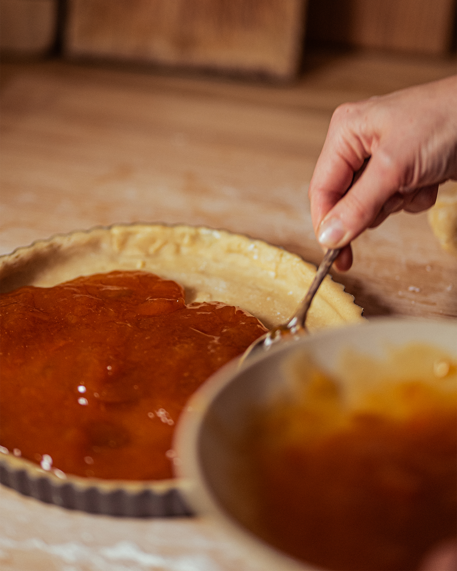 9. Spoon the cooled jam into the tart shell, using the back of a spoon to push it to the sides and level it out evenly.