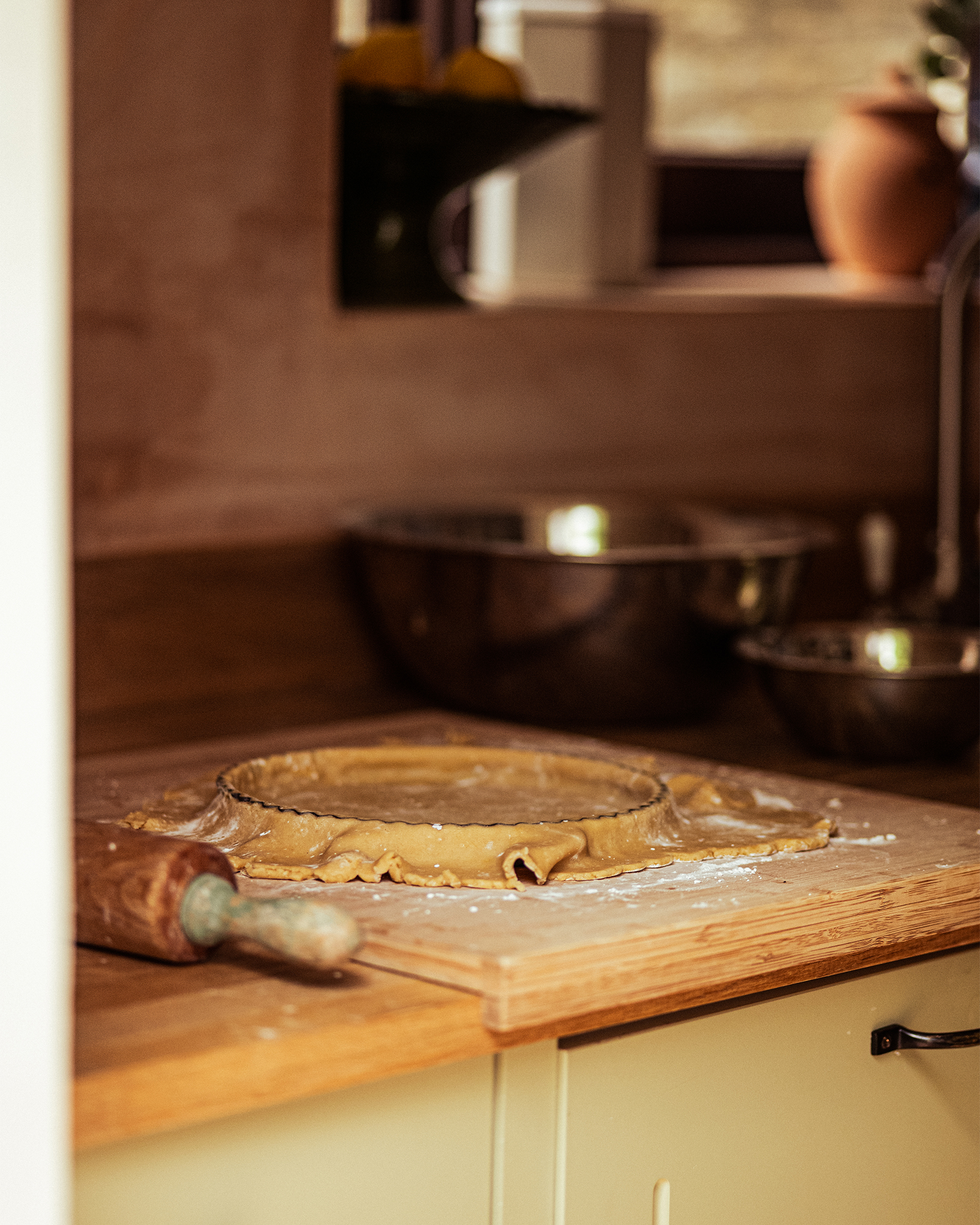 8. Transfer the pastry to the prepared tin, using your fingers to press it down into the edges and trim any overhanging dough off the sides. Use these scraps to touch up any areas that look a little thin and to help form a good crust around the rim.