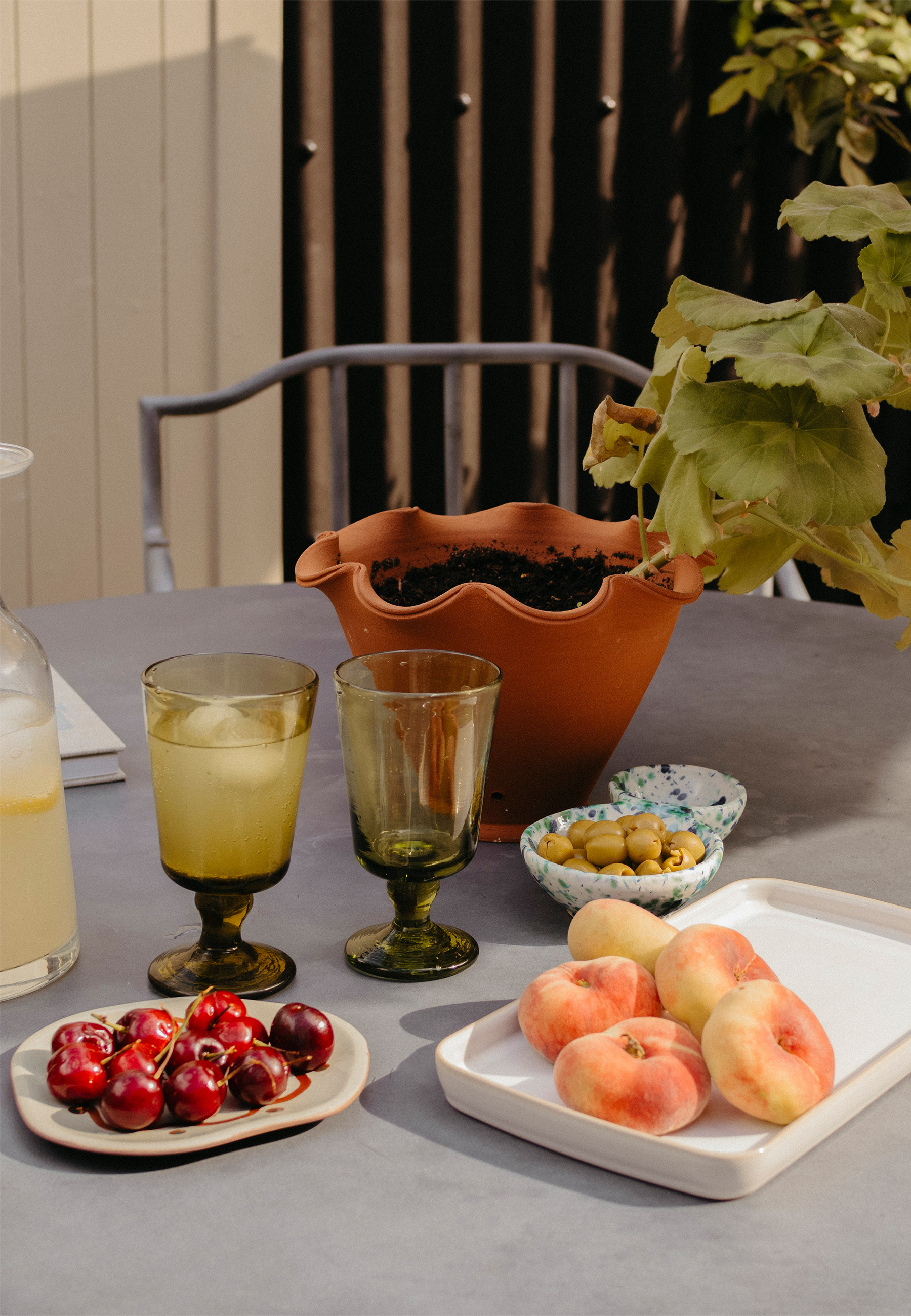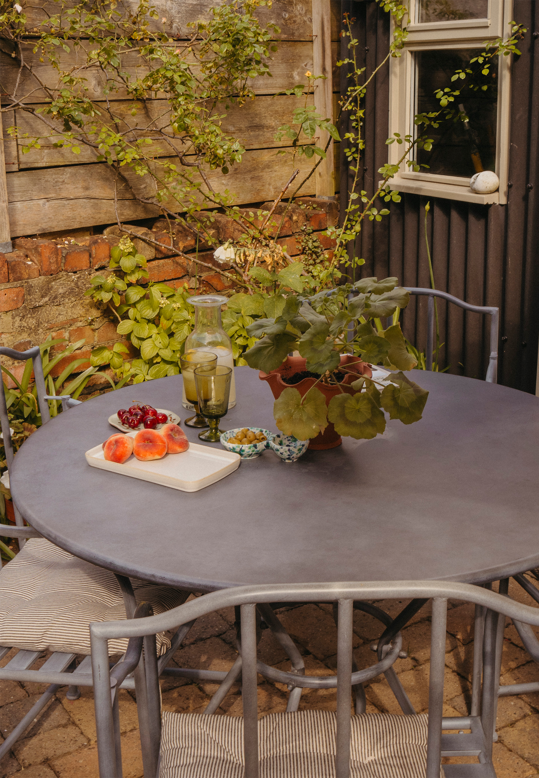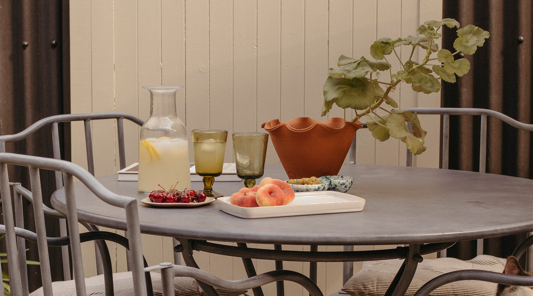 This summer, she has layered in a few new additions to her own garden tableau in the form of Rowen and Wren’s scalloped-edged Eden Pot, which now sits prettily atop her new set of Ludlow table and chairs.