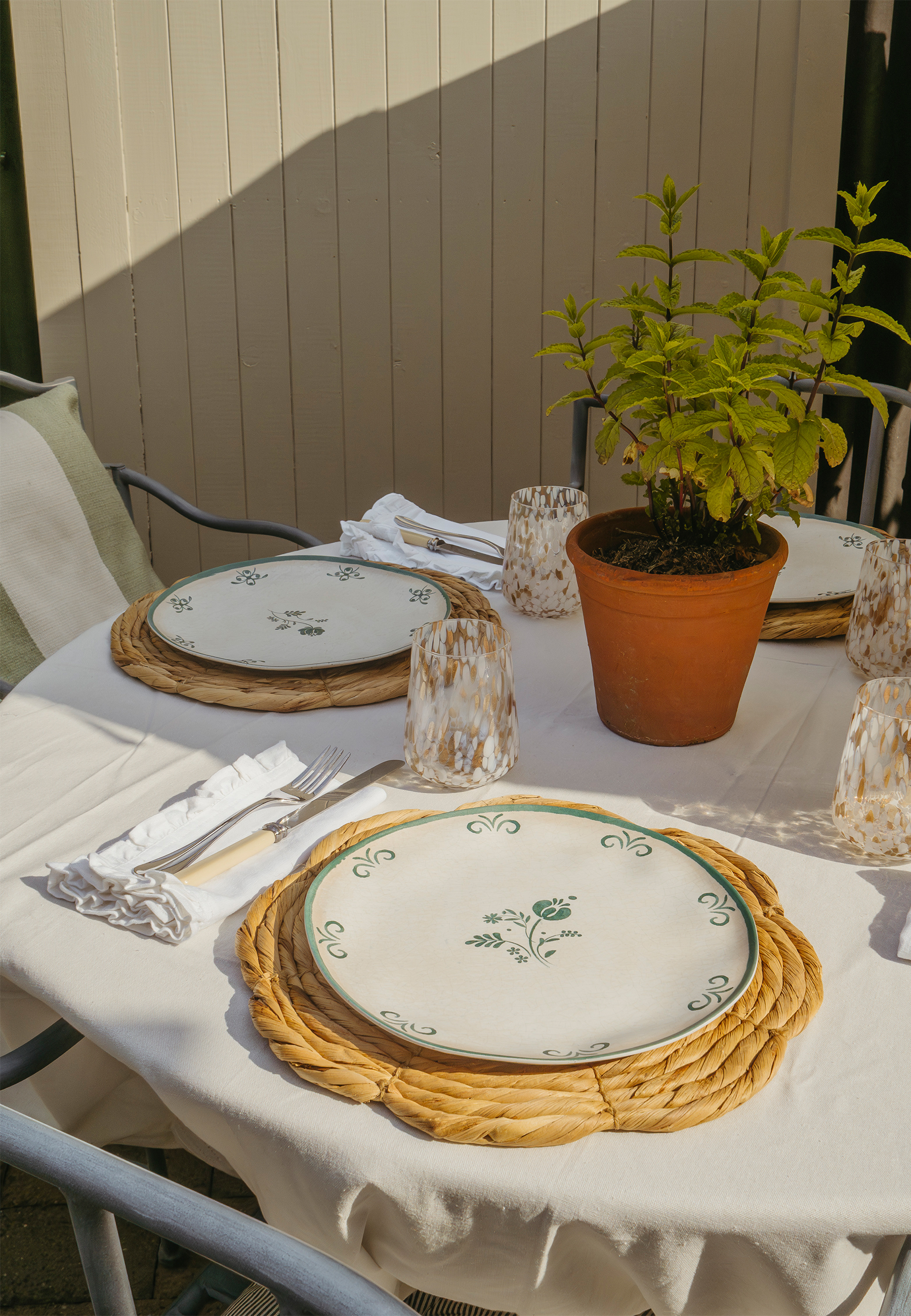 ‘I have a love for drama and simplicity when it comes to table settings,’ she explains. ‘Always a tablecloth, it adds an elegance, even outdoors. I love rattan details, so I always use placemats. I collect plates and glasses from everywhere I travel, and I love to use mismatched crockery and glasses on my table. It adds an air of casual dining, and it always sparks conversation. Flowers are a must – I tend to use what I have in the garden most of the time. If not, then something seasonal from the hedgerows, like cow parsley or oxeye daisies.’