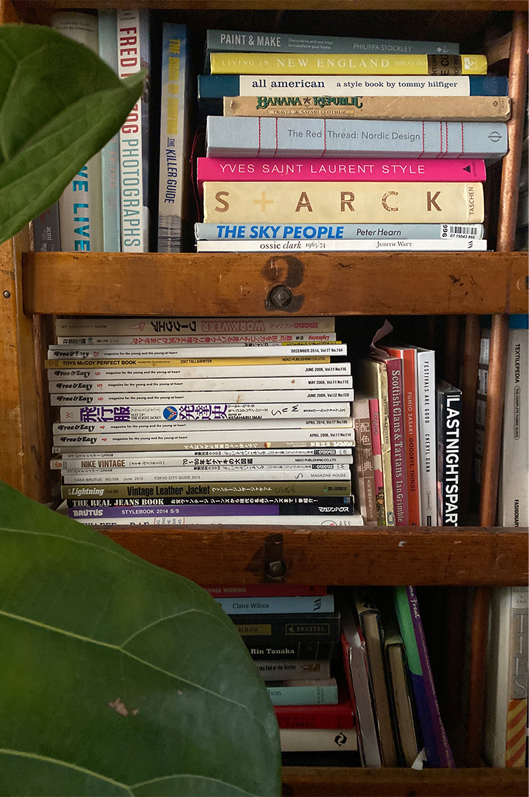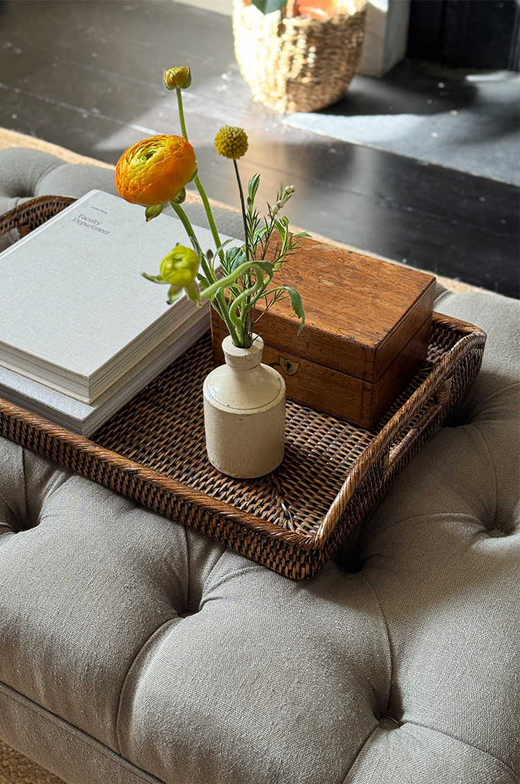 Chiefly, they comprise the vintage and the second-hand, adored not only for their sustainability but also for being suffused with character. ‘Our most treasured pieces are antique items we have kept for years,’ says Sam. ‘My favourite is the antique wooden shoe rack we have in our dining room holding all our books. It has moved around the world with us, first in our kitchen in New York holding all our cookbooks, then in our sitting room in Boston, and now here. I love the well-worn patina of the wood, its old markings from its days in a cobbler’s workshop and the industrial wheels.’ Another favourite is an antique armchair reupholstered by Marcus Spencer. ‘I absolutely adore all his work. He gives antique pieces a new lease of life with Egyptian calico and natural hessian, and it is a great match with our Rowen & Wren Elbert Footstool. Its timeless design and handcrafted details ensure it will remain a favourite piece of furniture for years to come.'