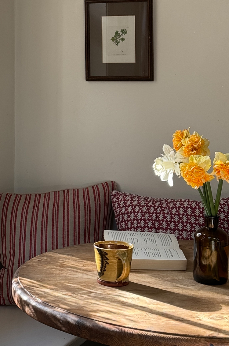 One way in which Sam reliably creates those pockets of delight is through bathing her world in the softening flicker of candlelight. She says, ‘Candlelight is always my go-to year-round for morning rituals and cosy evenings alike. Rowen & Wren’s artisanal stoneware candle holders are ideal for lighting up rainy spring mornings and creating a cosy atmosphere for wintertime dinners. The Mr Ben terracotta tea mugs are our constant companion – as we work from home they get a lot of use throughout the day, and are one of things that bring a glimmer of joy to the everyday.