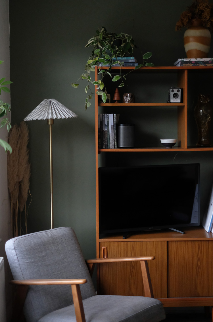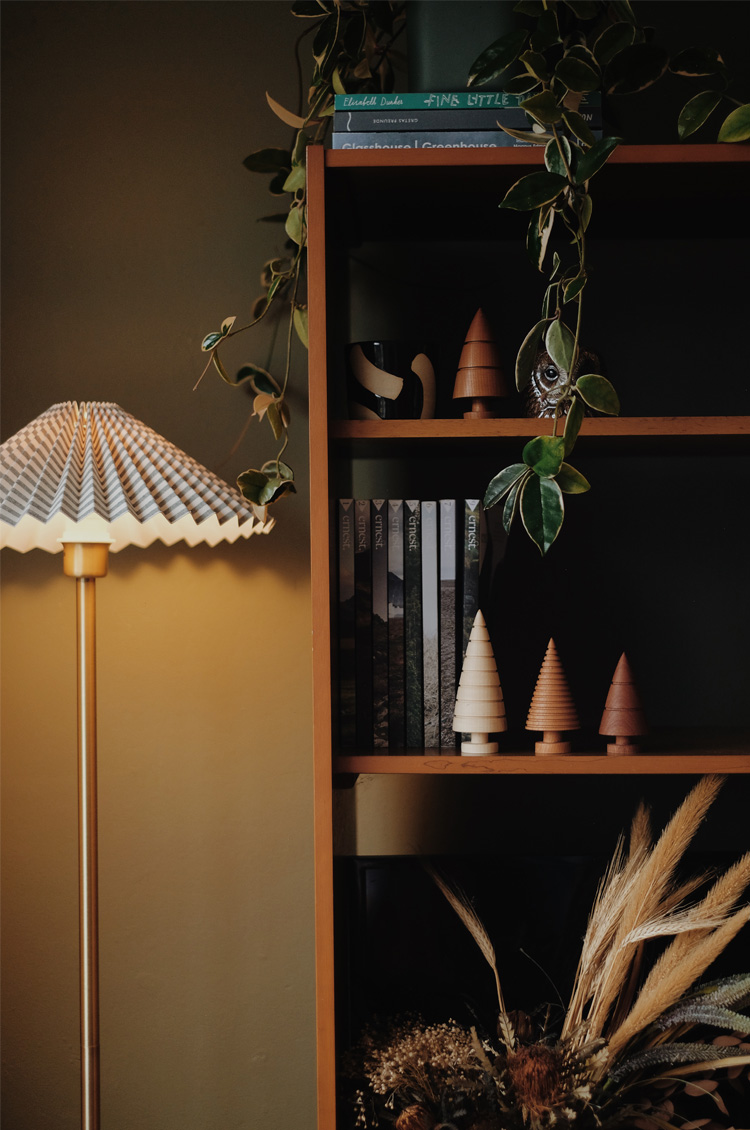 And, standing watch over her while she hungrily devours her library is a small piece she holds particularly dear. ‘I am very attached to a little wooden tree ornament that my partner made, which sits in pride of place on a shelving unit in our living room. He hand-turns wooden objects such as bowls and vases, but this small cherry wood tree is my favourite piece of his in the house.’