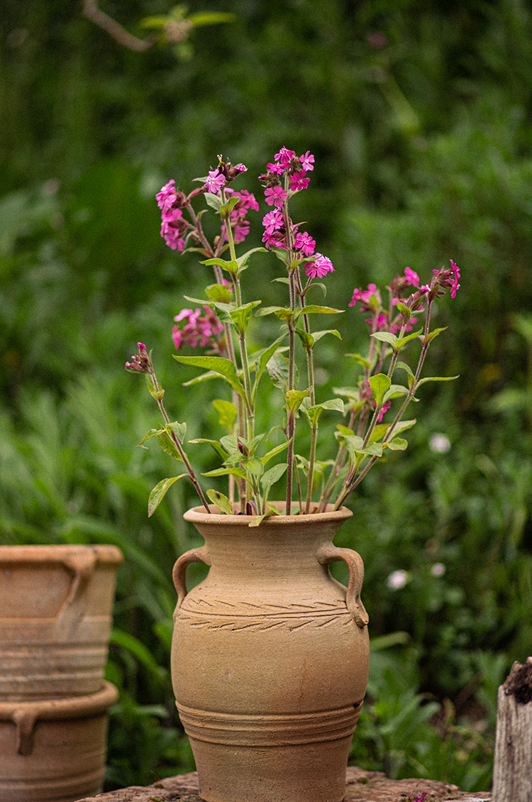 I love watching the meadow at the back of the lawn springing into life, especially as it reaches its glorious apex, teeming with wildflowers and dotted with laden fruit trees. I like to keep my empty pots lined up on the surrounding wall in front of it, and so I was delighted to spot this pink campion, an escapee from the meadow which has taken up residence in the pot, casually looking as though it had been intentionally planted there. A very happy accident and a very happy weed.