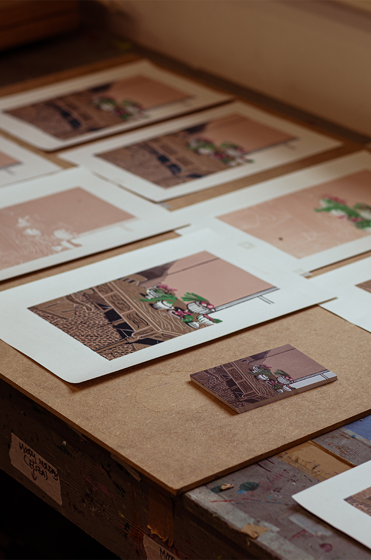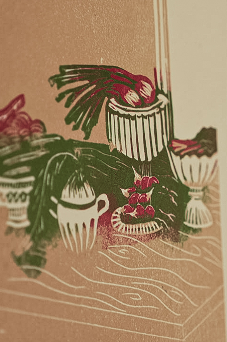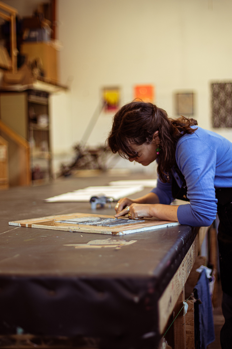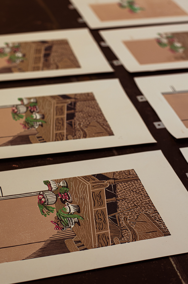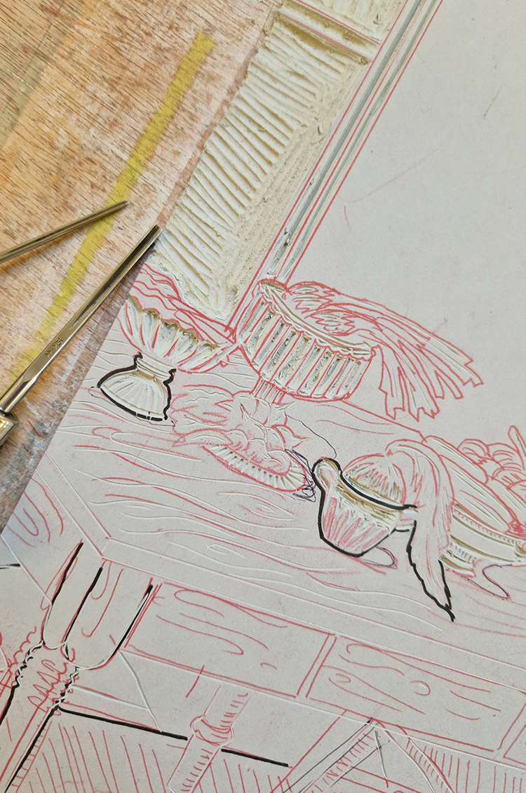 What I love about lino cutting is that you don’t see the final outcome until the end. It always feels a bit magical to pull the paper off the block. I also love the physical process of drawing and carving on the block; there’s something extremely meditative about it and almost sculptural, using chisels and cutters.