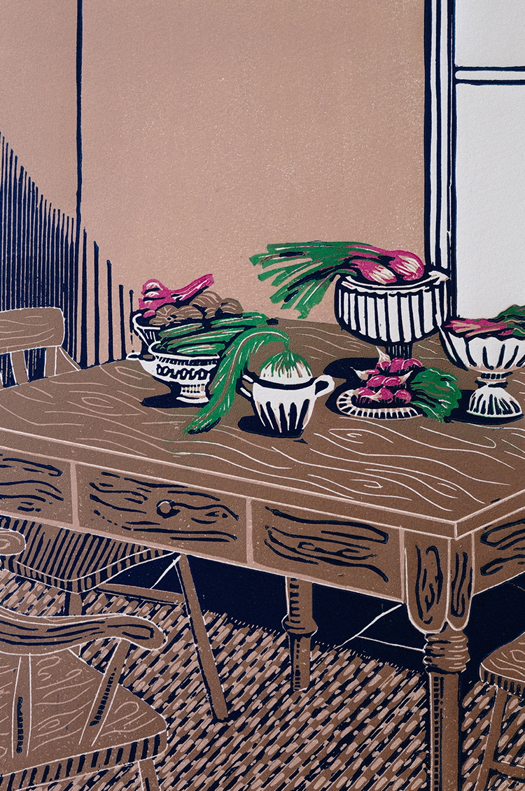 When Rowen & Wren contacted me, I was very excited because it felt like a really natural collaboration. I was particularly drawn to the kitchen table scene and the brightly coloured vegetables, as I could imagine the person who lived there and who had grown and arranged these vegetables in the beautiful vases and bowls. It’s a scene that focuses on the beauty of everyday objects.