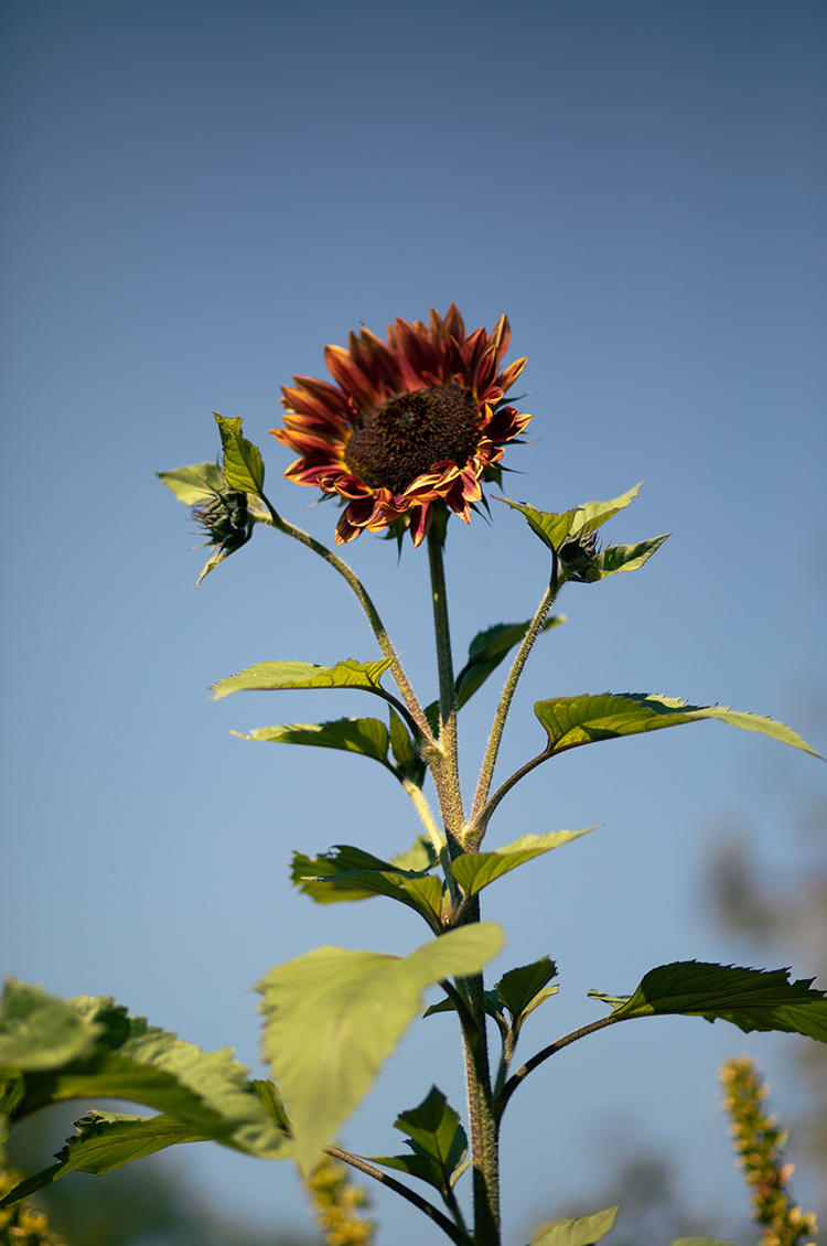 My medley of sunflowers has finally exploded into glorious life since the temperatures have warmed up a little. They have been well worth the wait – and, as with last year, they are all thanks to my dear dad who always grows the most sublime shades in rust and dark aubergine, which look gorgeous mixed in with the yellow fennel and pops of pink from the dahlias.