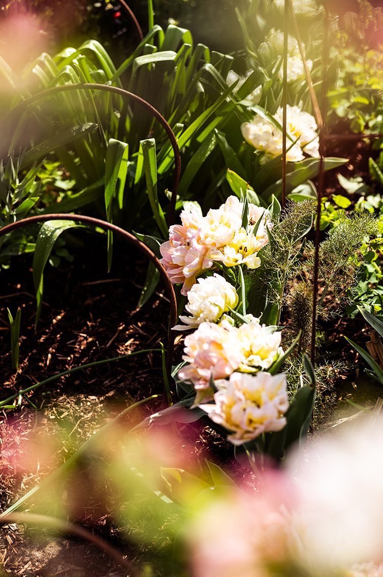 A little earlier than last year, the first of the tulips are beginning to unfurl, happily catching the spring light. We do seem to have lost quite a few this time, though, with much of the foliage coming up blind. I’m making a quiet note of where autumn top-ups might be needed – but one new favourite that is blooming beautifully just now is Tulip ‘Password’. Its soft, frilled petals are layered so densely that it could almost be mistaken for a peony. Glorious.