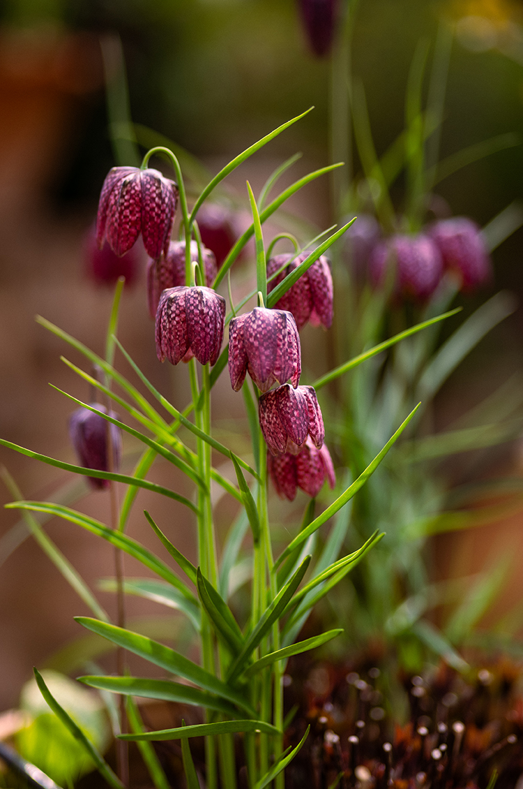 One sight that never fails to cheer my soul at this time of year is the demure and exquisite snakeshead fritillary. Each spring, I vow to plant more and more of them for the following year. Their sweetly bowed heads are currently delighting us in the odd pot, as well as in small clumps in one of the beds. But I do so long for a true carpet of them one day.