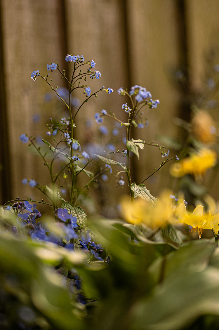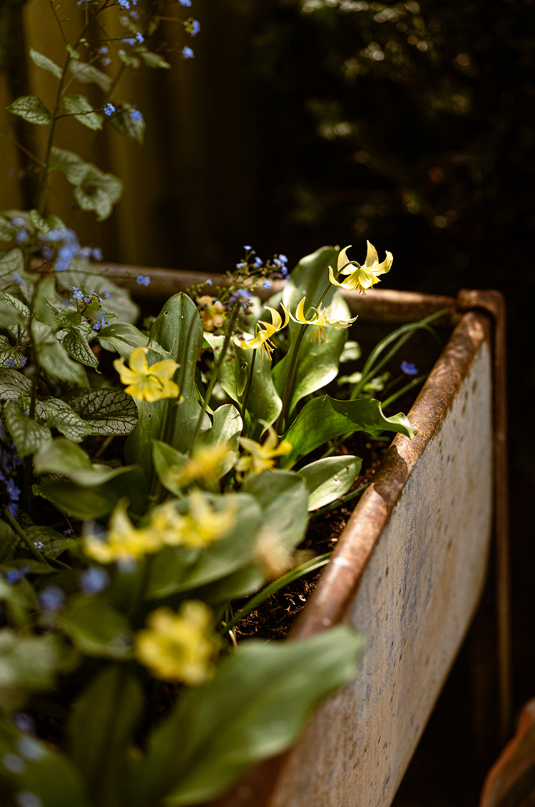 I am thrilled that, after many seasons of trial and error, I finally seem to have unearthed a floral miscellany that’s thriving in my large metal trough, tucked away in the shade at the entrance to the greenhouse. The triumphant pairing of Erythronium 'Pagoda' and a type of woodland forget-me-not seems to be very happy in this shady spot – which is all the lovelier, since they look so very beautiful together.