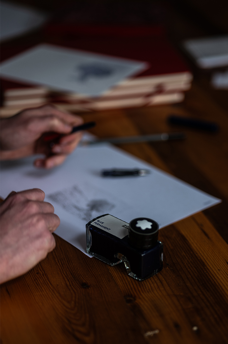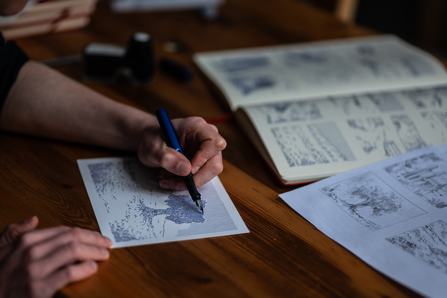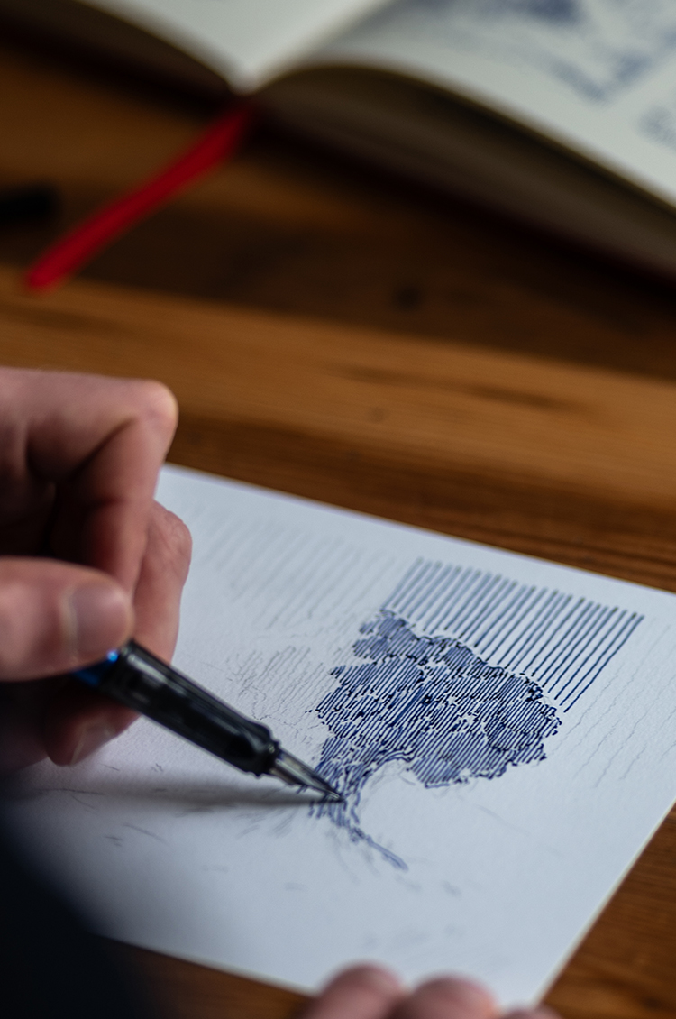 At the moment, I focus on original, hand-drawn fountain pen ink works. I find the smooth flow of ink from the nib to be almost meditative, helping me slow down and fully engage with the tactile process of drawing. I’m drawn to blue ink in particular for its calming quality, and I’ve been delighted to hear that many viewers experience the same sense of stillness when looking at my work.