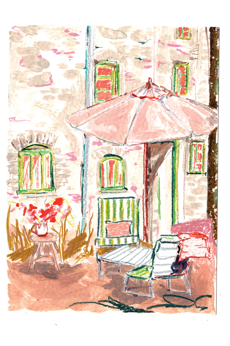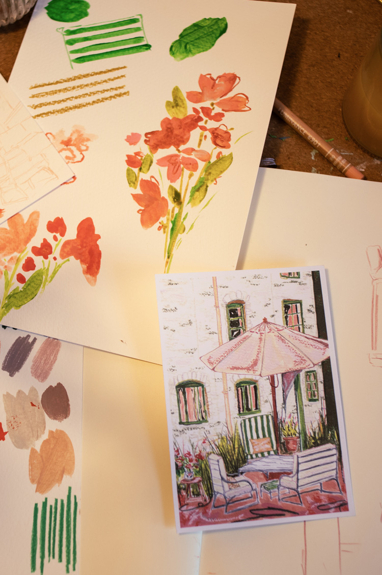 It was an absolute dream to work on this postcard artwork for the Spring 2023 Rowen & Wren collection; the whole development of the piece was super organic from start to finish. The postcard I designed depicts a gorgeously warm day outside a house with the most charming green windows that complement the new green and white circus striped cushions of the Sudbury Sunloungers.
