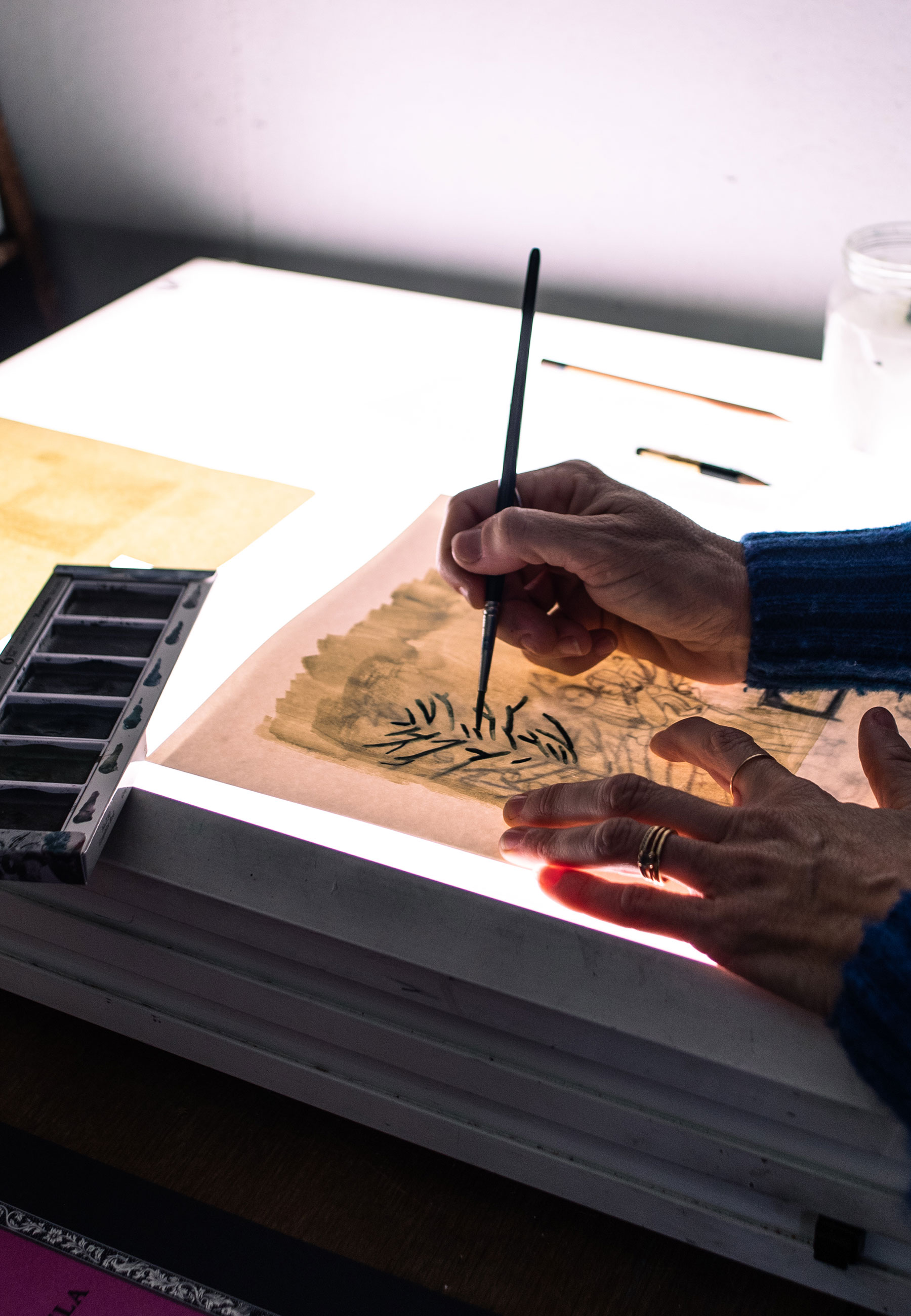 I work mainly in mixed media. I enjoy using many materials, getting messy, and feeling connected to my work. For this illustration for Rowen & Wren, I used a mix of paint, pencils, soft pastels, and collage. I use the computer right at the end if I need to touch up anything, adjust colour, and send it to a client, but I try to use it as little as possible. I prefer the decision-making that comes with making art in a more direct way; there are too many choices or going back if I use the computer!