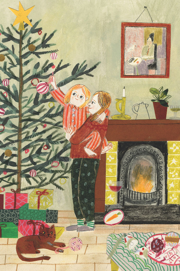 The images of your Christmas collection evoked that feeling of the days before Christmas - the build-up and excitement. I thought of the small but important things you do as a family before Christmas to get ready. Particularly at home with my children, they take great delight in decorating the tree and hanging baubles we've collected or made over the years. For the illustration, I wanted to have a parent and child sharing this moment of decorating the tree, making sure they were fully connected in their placement in the middle of the page.