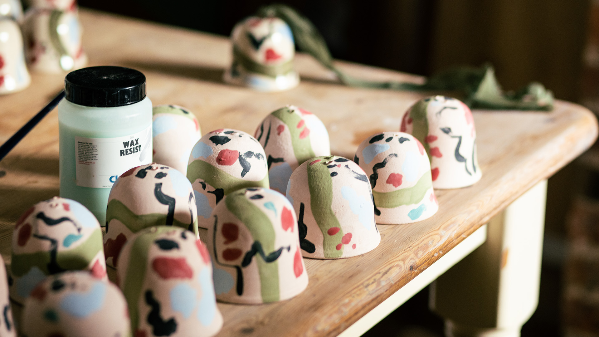 I appreciate things that are neat but also have a slightly unfinished element - a wobble, an uneven rim, a paint dab that has run a little. The bells were a beautiful project. I love anything that I get to make for Rowen & Wren because the creative process is so fun and collaborative. For the ceramic bells, I worked from mood boards to help refine the shape and fabric samples to use as colour inspiration. I drew some samples, and once a shape had been agreed upon, we made some tests decorations and different-shaped bells. This shape was the final choice.