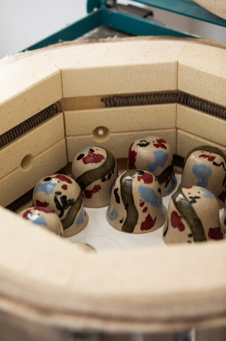 After this has been set to dry a little so that I can pick it up without denting it, I paint the pattern on with underglazes. Once that has dried, it's ready for its first firing—the bisque. After that, it gets a little wash, and I wax around the base of the bell that would touch the kiln shelf and dip it into a transparent glaze. It then placed back into the kiln for its final firing.