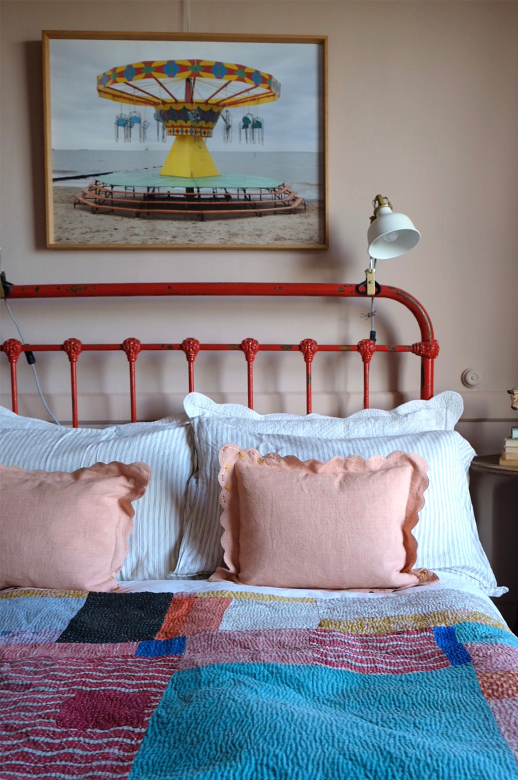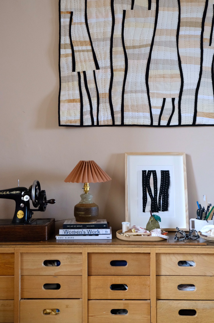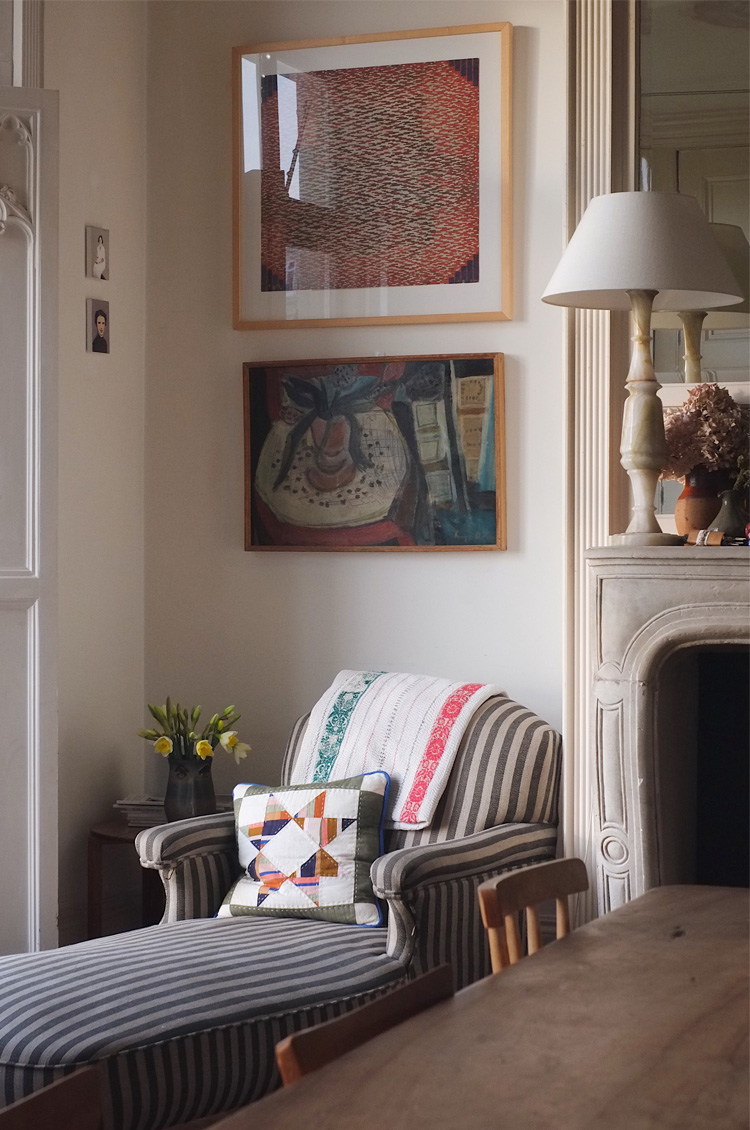 Homes have a tendency to echo their owners back at them, and that goes double in Jessie’s case. Having felt stymied by the prescriptive world of quilt-making in the nascent stages of launching her textiles, she celebrates the imperfect!’ If Jessie’s methods in the often-restrictive landscape of quilting sound unorthodox, the results are works of staggering beauty, their graphic lines bold and organic. It stands to reason, then, that one of her very favourite pieces in the house should similarly flout the rules.