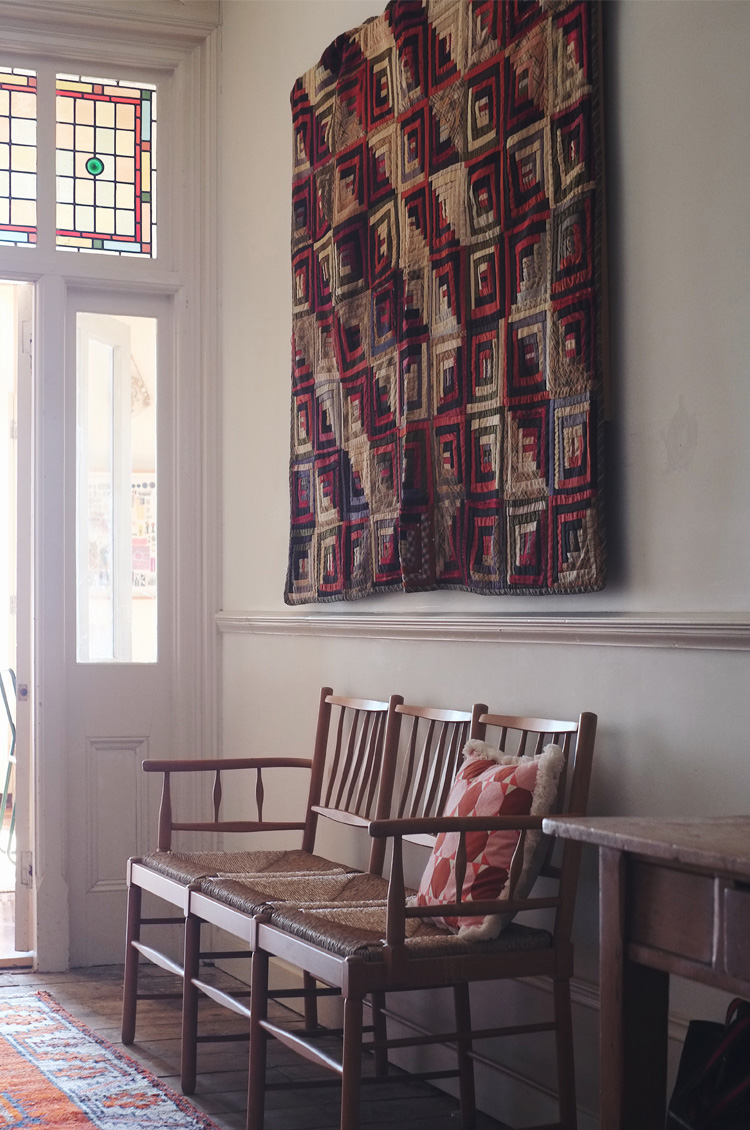 ‘It took me a good two years searching eBay for a log cabin quilt I could afford,’ she explains of a piece that now hangs splendidly in her hallway. ‘It’s extra beautiful to me because it doesn’t follow the ‘rules’ of log cabin patterns and the maker has gone ahead and placed their blocks in a wild, almost haphazard design. The threads are starting to wear thin in places and you can see every tiny hand stitch and the layers of fabric underneath.’