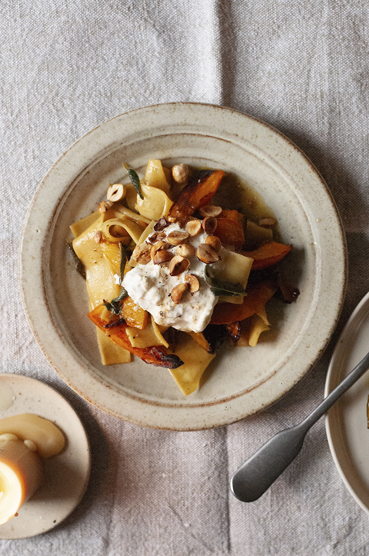 9. Spoon the pasta and pumpkin onto four plates then spoon over the sauce left in the pan. Divide the burrata into four and place on top of the hot pasta.