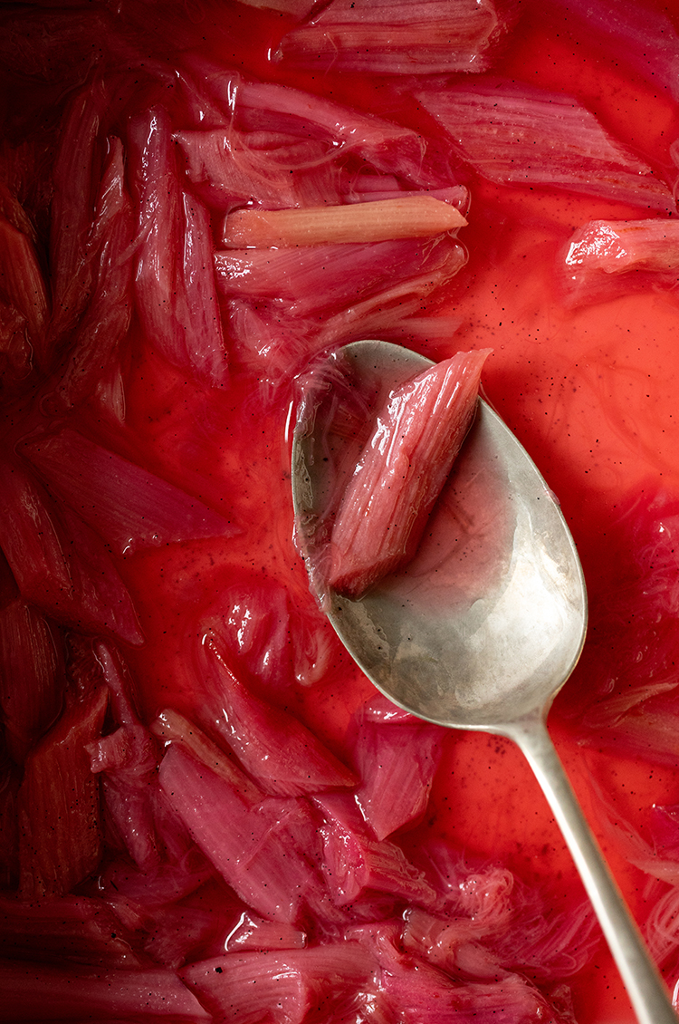 2. Cut the rhubarb into 2cm batons. Toss with the sugar, water, lemon juice and vanilla, then tip on to a medium baking tray so the rhubarb sits in a single layer. Roast for 10 minutes then check. Return to the oven for a further 5 minutes and check again. The rhubarb should be soft and beginning to fall apart after 15-20 minutes. Set aside.