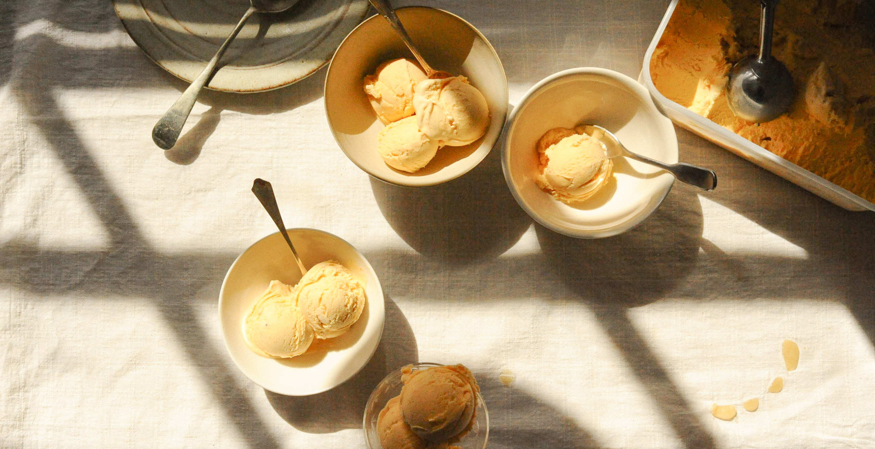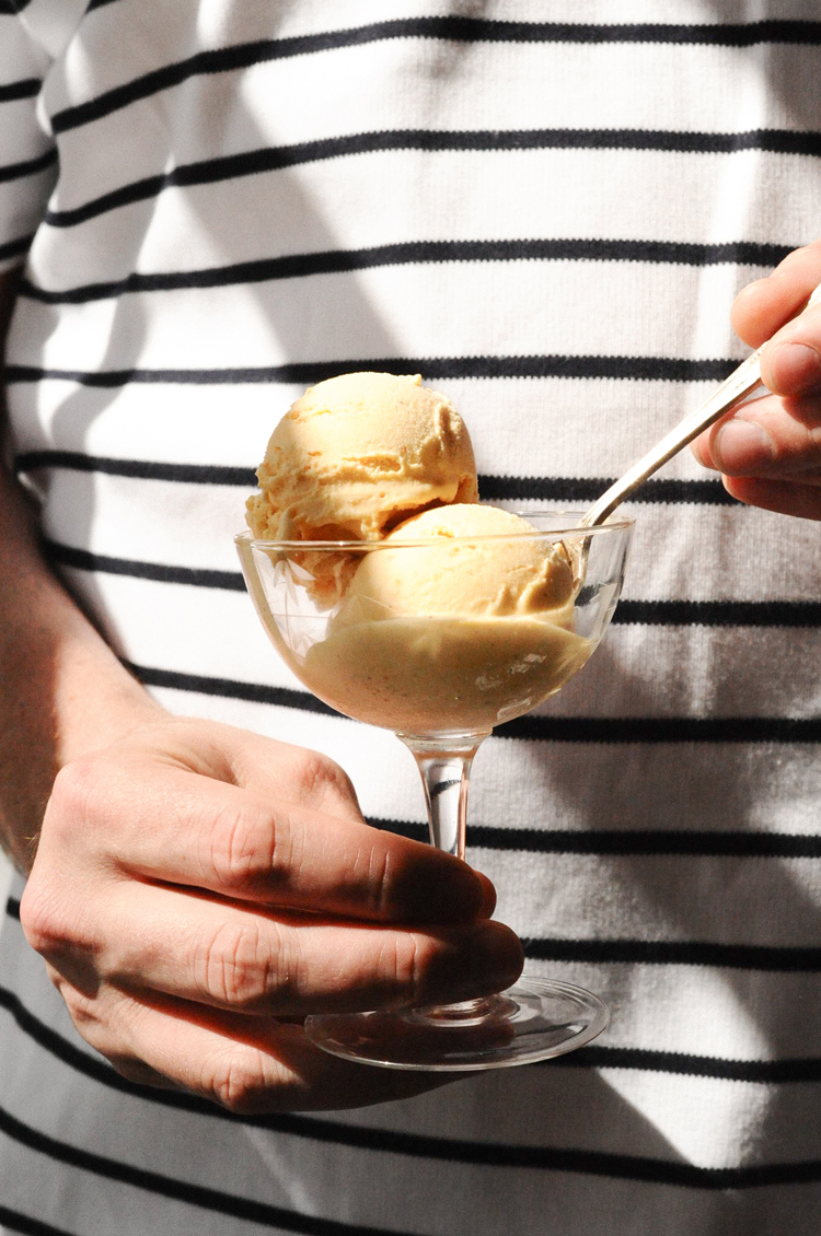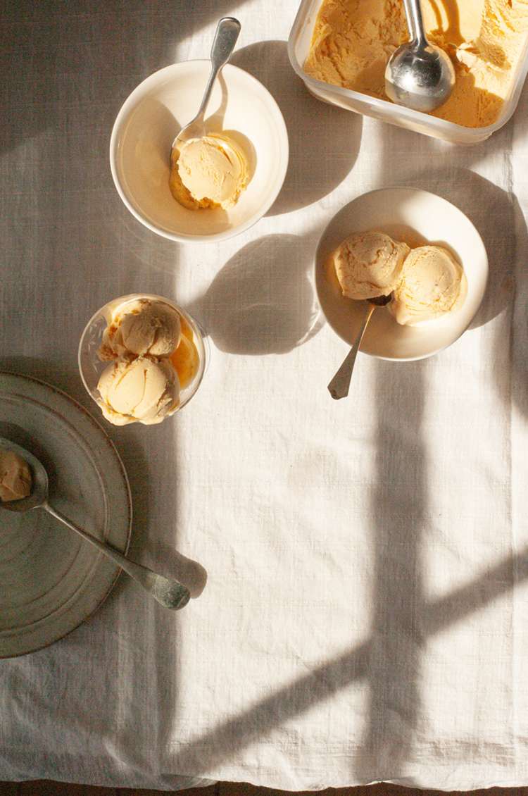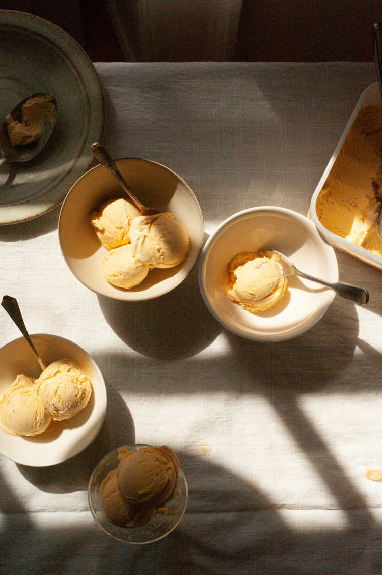 Summer's calling and what better tribute than a home-churned scoop (or several) served in either waffle cone or coupe. Made, as always, by our friend and food writer Flora Shedden, follow along as she blends a favourite syrupy stone fruit with a healthy drizzle of honey to fill your freezer all summer long. We rather like it served with roasted fruit, cantuccini or toasted almonds.