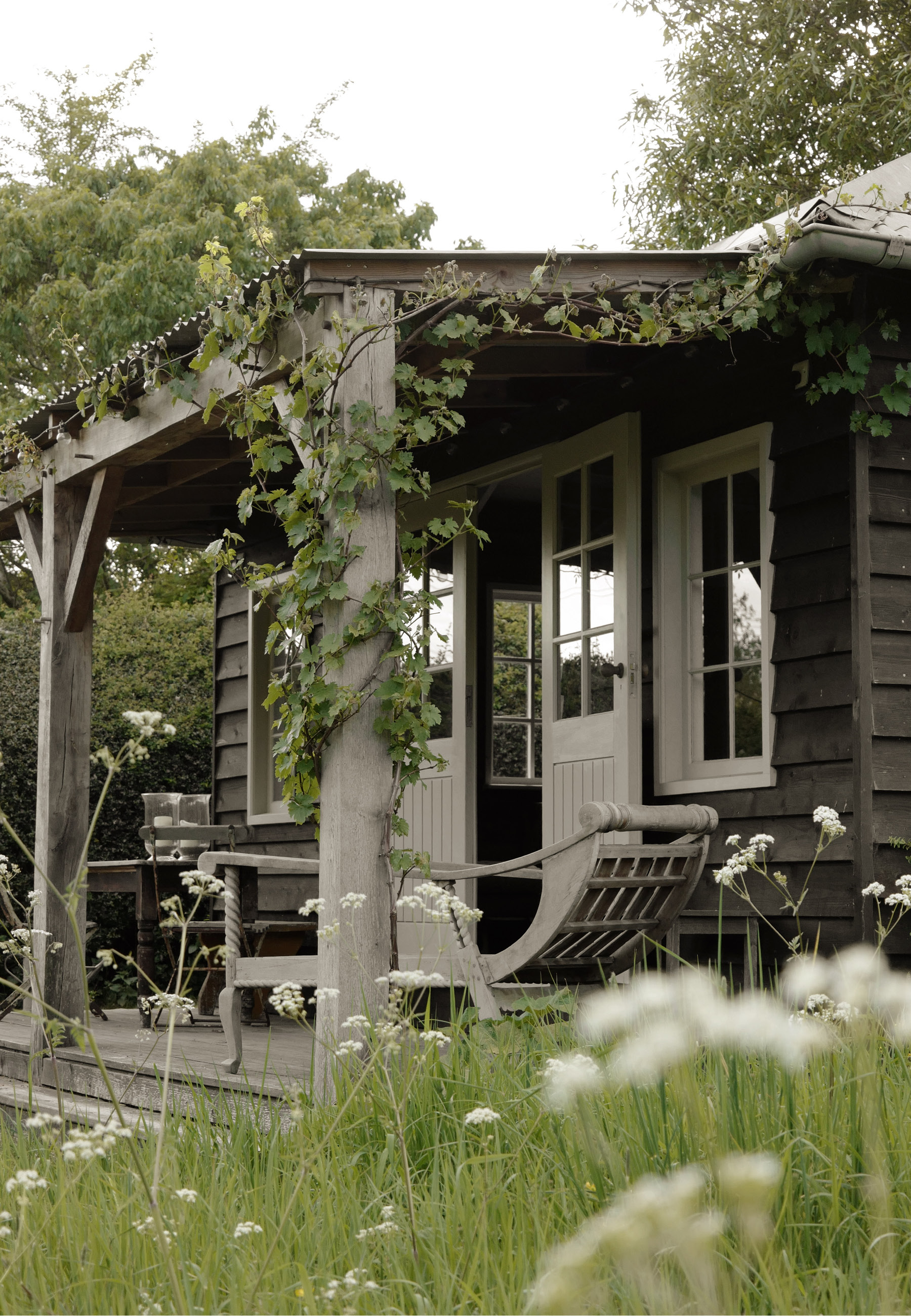 ‘The idea behind my shed was originally to have a space for photography and where I could play with flowers and not have to tidy up immediately afterwards!’ she says. ‘It has become so much more than that: we eat in there too – it’s so cosy with the wood burner in winter and a lovely place to have a coffee on the veranda in the summer. Wanting to be as sustainable as possible in its construction, we found the original shed on eBay and my husband rebuilt it adding an oak framed veranda and using windows that I had sourced on Facebook Marketplace. It has become such a large part of my life. It is wonderful to finally have what Virginia Woolf once said was essential for all women: a room of one’s own.’