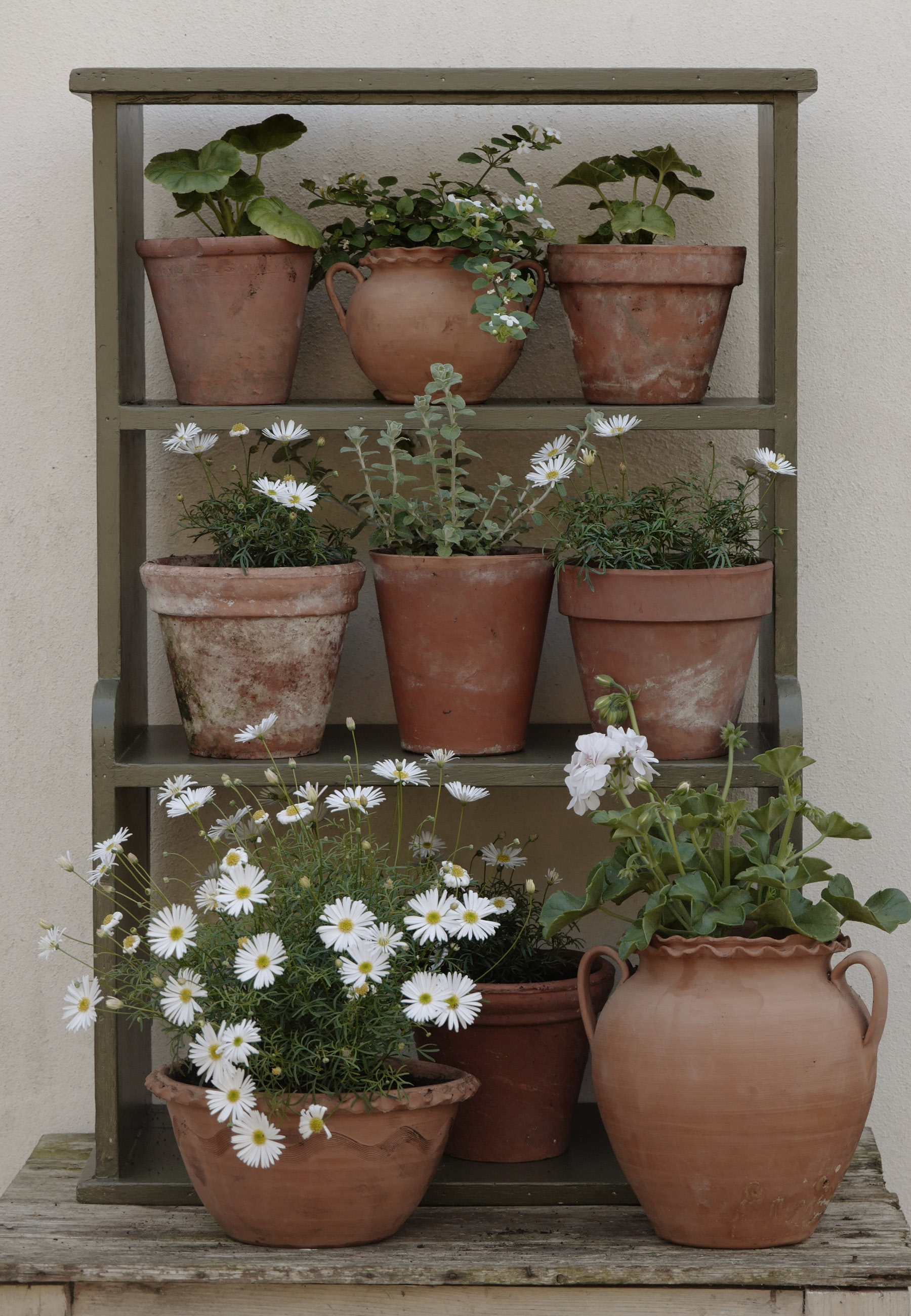 This year, she’s busily potting up a small medley of containers, including Rowen & Wren’s Etta and Agni terracotta pots. which will soon burst forth with vivid pelargoniums. ‘I’m very drawn to natural products, and these terracotta pieces are perfect for seasonal planting. I always grow pelargoniums in my greenhouse for summer and have a collection of vintage planters in which to display them. These characterful pots will go perfectly with mine and I know they will age beautifully.