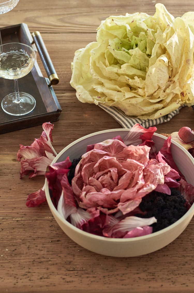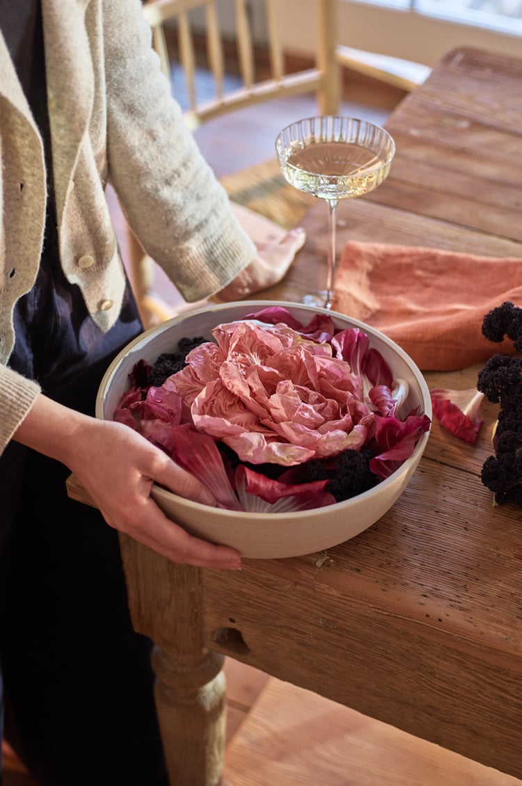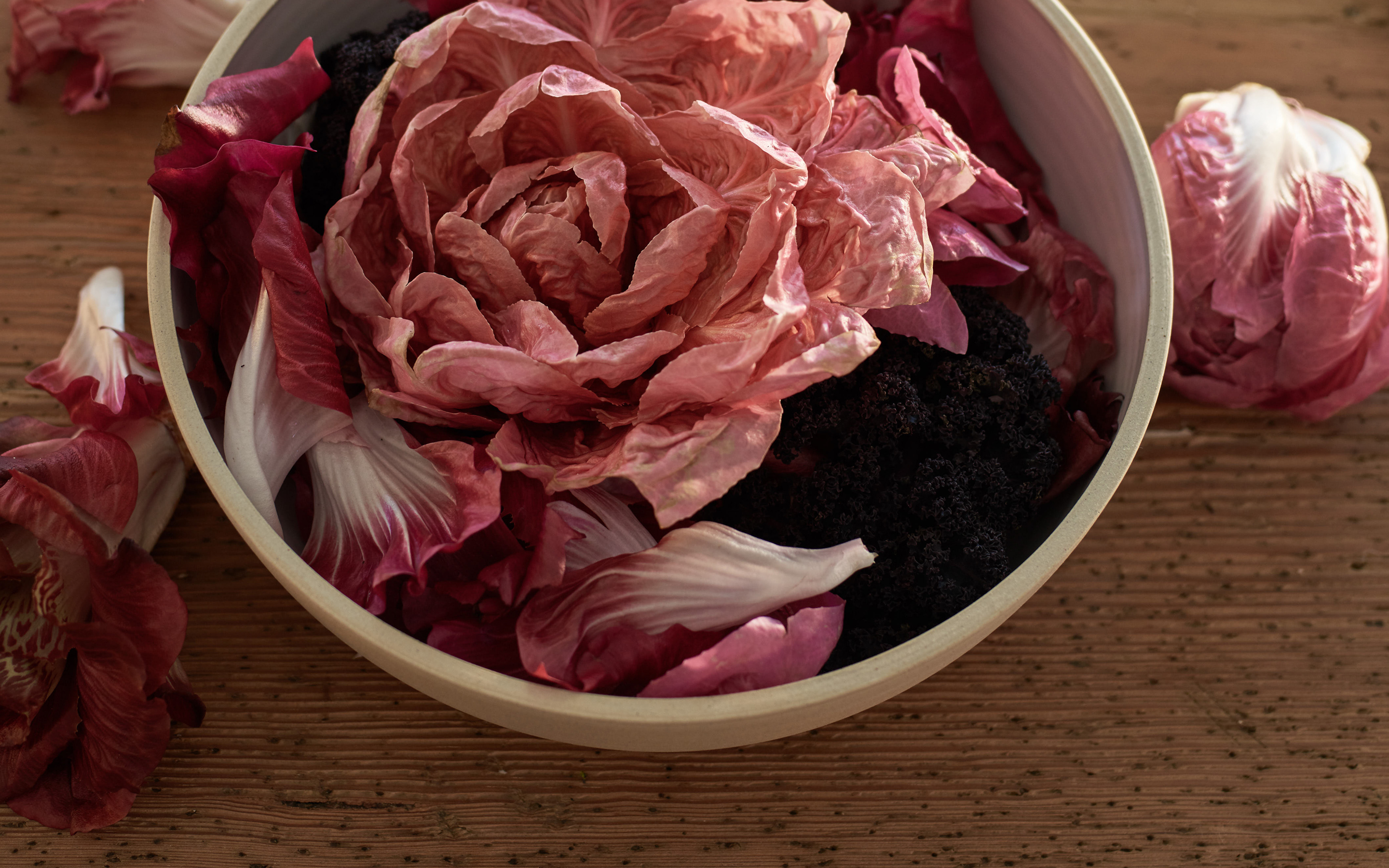 Native to northern Italy, the pretty blush pink rosalba variation of the quintessentially bitter tasting radicchio is, to us, as much as a palette joy as it is one for your palate. Whispers of sage green and blush-tinted white lurk amongst its many layers, but the overall ‘millennial pink’ tones of its sweet, floral leaves are what defines it most of all. How we delight in spotting it at farmer’s markets throughout the winter months and dressing it alongside the more classic crimson-coloured variety; it comes as no surprise then that we elected it as our vegetable of choice to hero in our winter campaign.