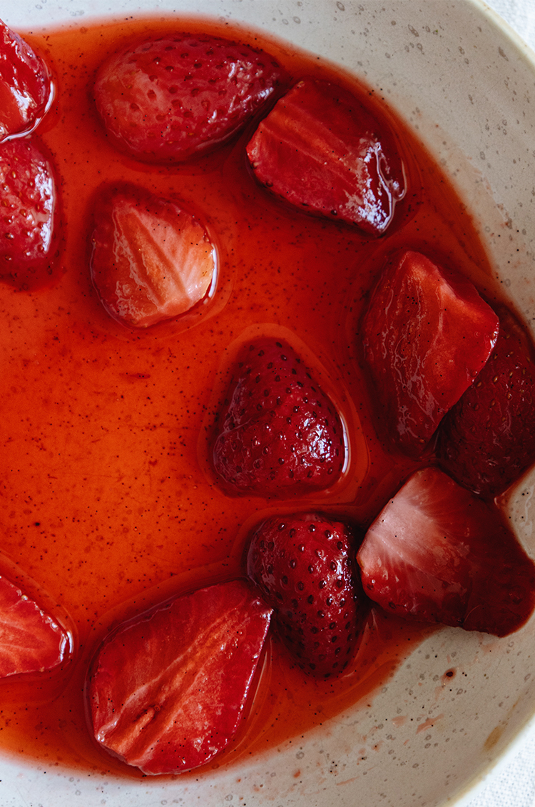 2. Cut the strawberries in half and place on a deep roasting tray so they are snuggly fitting. Cover with the sugar and lemon juice and toss together. Scoop out the vanilla seeds from the pod using the back of a knife and mix through the strawberries. Add the vanilla pod to the mix and place in the oven for 10-20 minutes or until the strawberries have softened but are still holding their shape. Set aside.