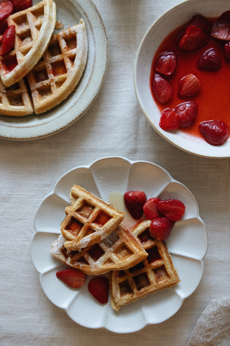 6. To serve place the waffles on the plate and dust with icing sugar. Spoon the cooled strawberries on top alongside the syrup left in the pan. This would also be delicious with creme fraiche or thick greek yoghurt.