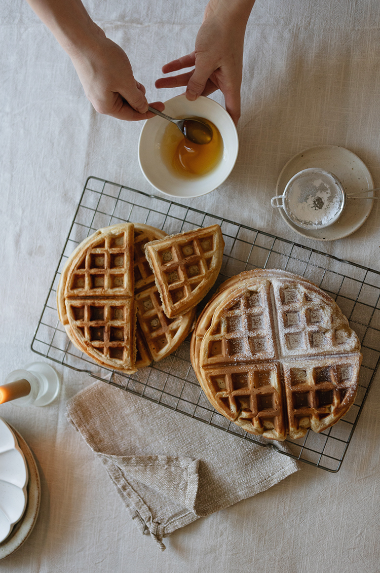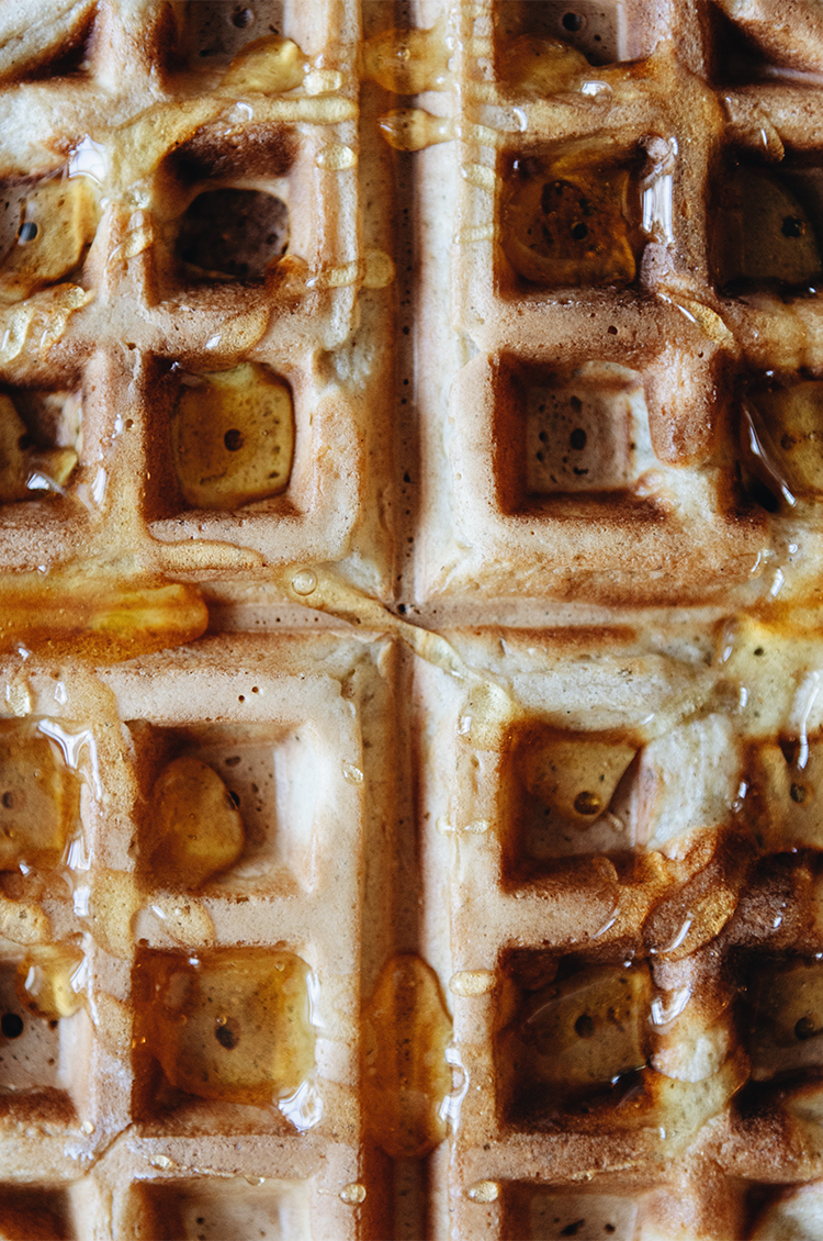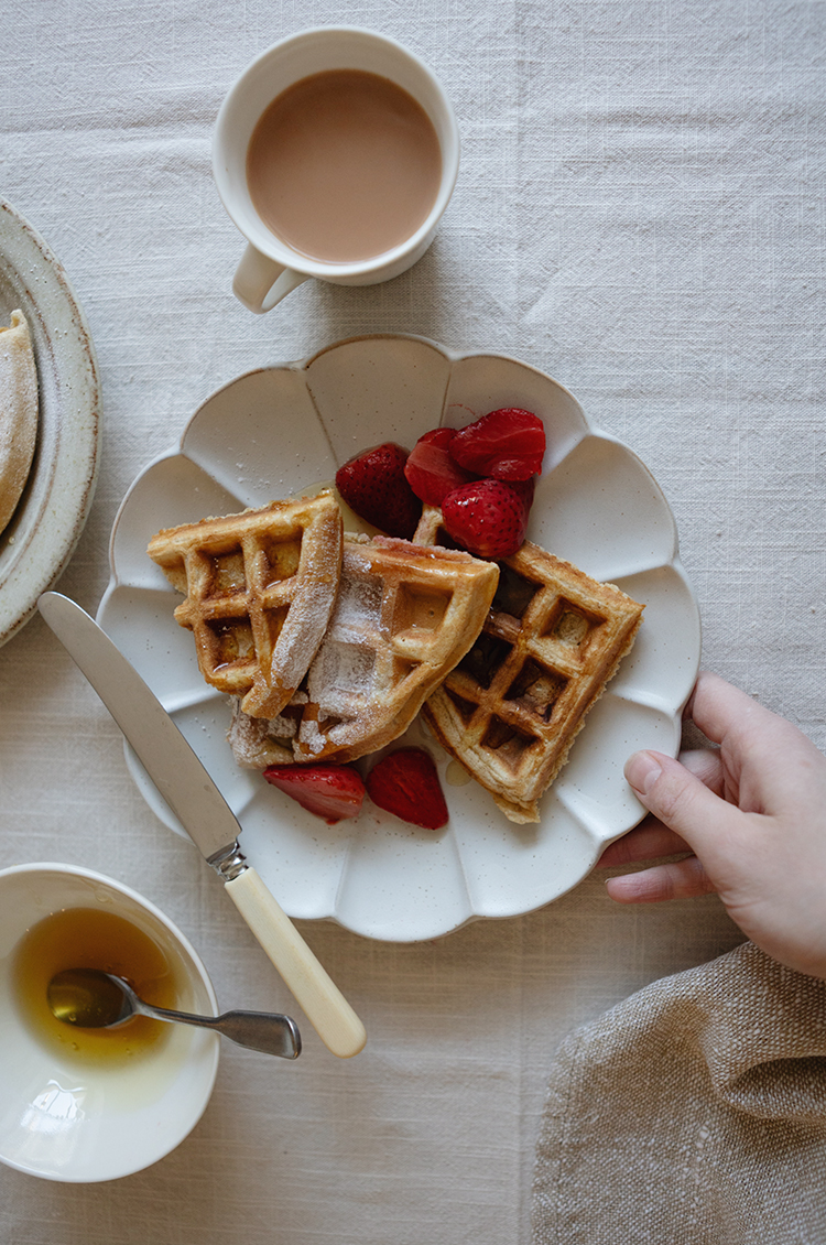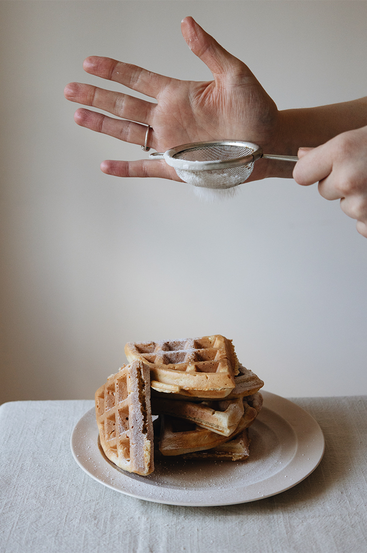 3. For the waffles weigh the flours, baking powder, sugar and salt in a large bowl and whisk together. In a separate bowl mix together the yoghurt, milk, eggs and sourdough (if using). Once well combing pour into the dry ingredients and whisk together will a little vanilla bean paste.