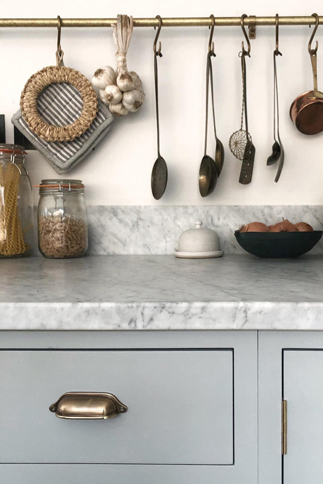 "When we shared a shot of the kitchen on our grid, we had so many questions about the worktop. I'd expected all eyes might be on our brass hanging rail but not so! It is in fact honed Carrara marble.