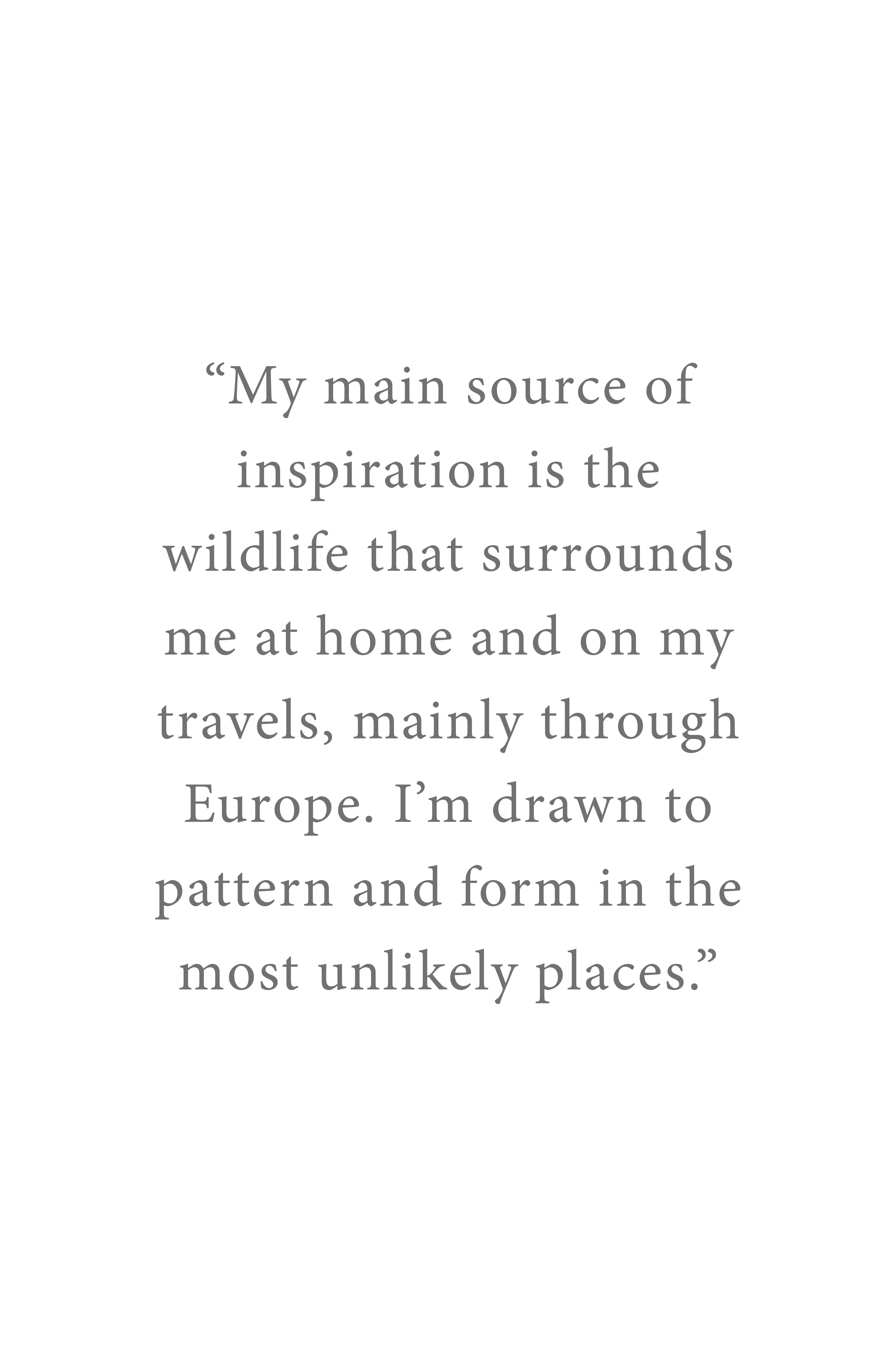 My main source of inspiration is the wildlife that surrounds me at home and on my travels, mainly through Europe. I always take lots of photographs, from leaves to architecture to shadows. I’m drawn to pattern and form in the most unlikely places.