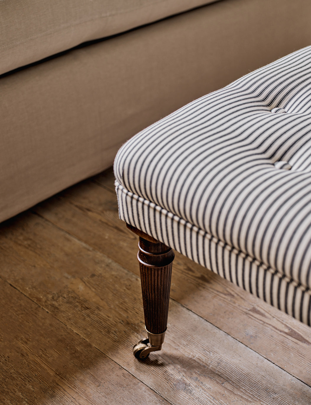 Joining our upholstery collection is the Freyer Footstool, distinguished by timeless button detailing, elegantly fluted oak legs, and an irresistible invitation to unwind.