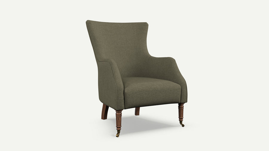 - Upholstered in a textured olive green linen, grown and woven in Belgium with a delicate piping detail