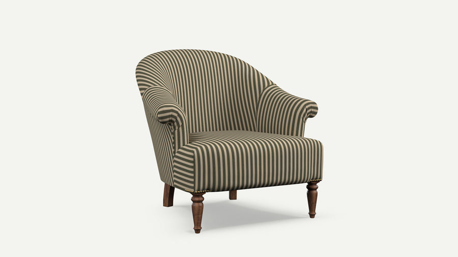 - Upholstered by hand in a timeless heritage green and warm white stripe