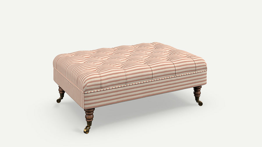 - Upholstered by hand in a soft heritage pink and white stripe with piped detailing