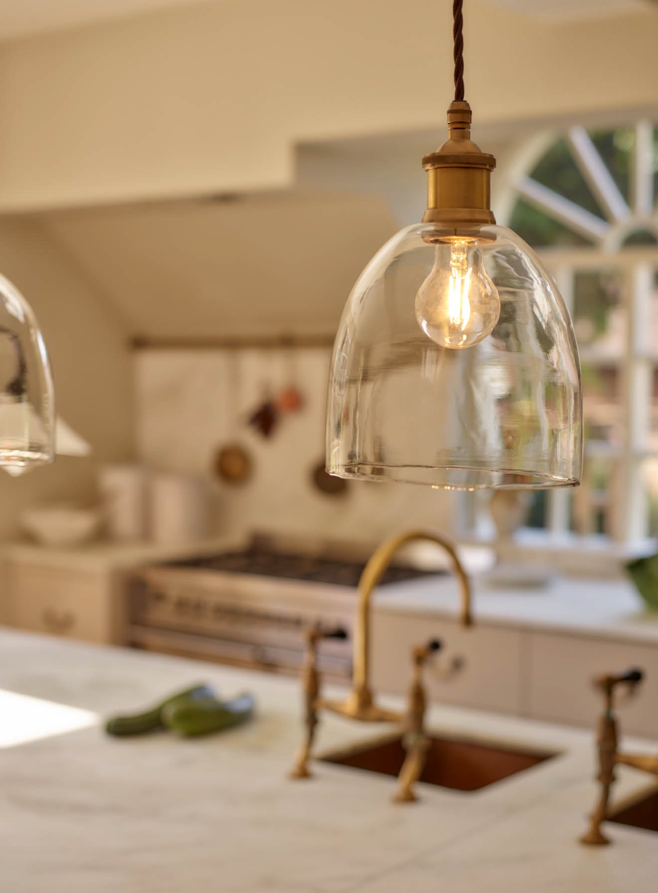 - An elegant domed hand-blown glass pendant with bell-like contours