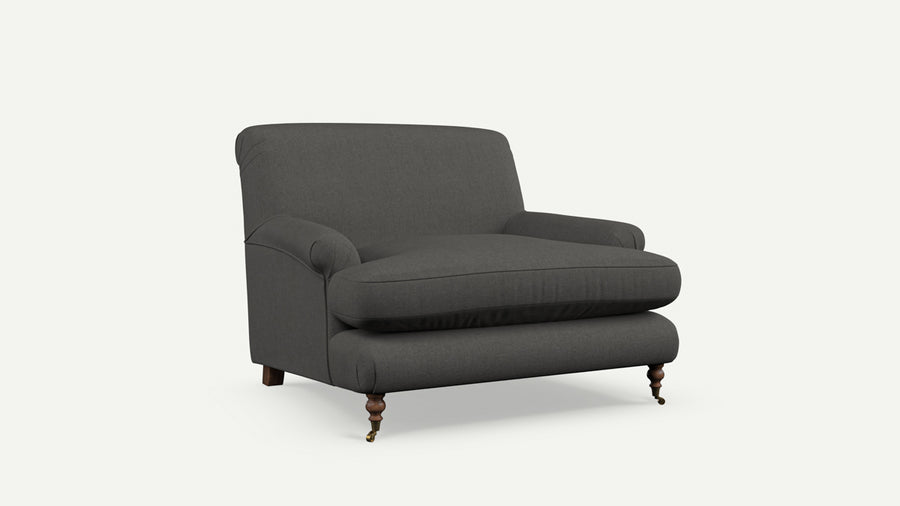 - Upholstered in a textured a mid-grey linen, grown and woven in Belgium