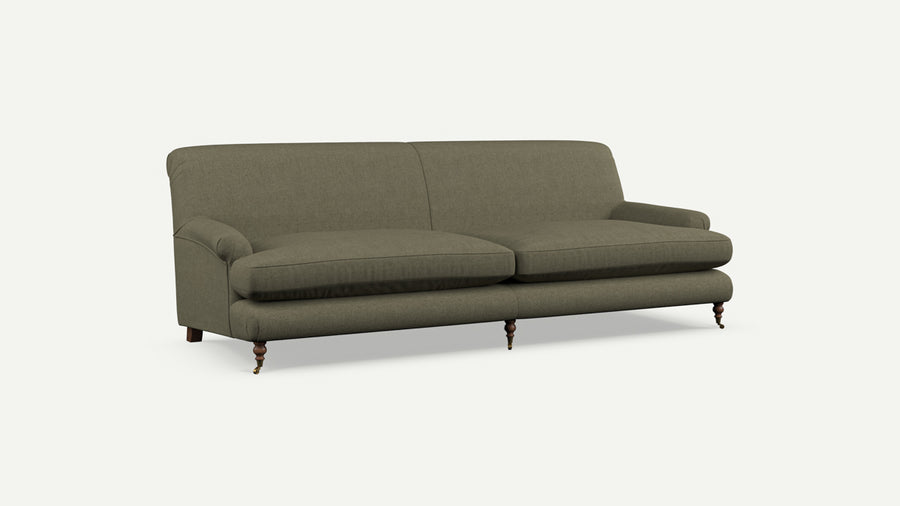 - Upholstered in a textured olive green linen, grown and woven in Belgium